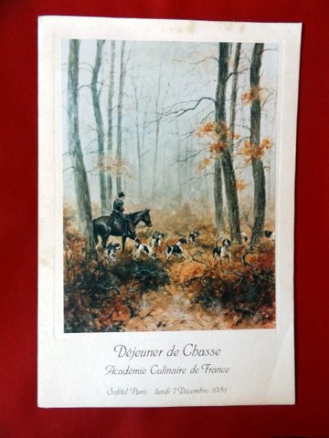 Paris, éd. Académie Culinaire de France, 1981, EDITION ORIGINALE, pt. in folio (23 x 34 cm), 6 pp., cartonnage crème souple, couv. reproduction en coul. de scène de chasse ( Baron Karl Reille ou Baron Jules Finot ?) sur vignette collée et texte en brun éd., sur les autres pages, texte en brun avec les remises des distinctions honorifiques, la composition du menu avec les vins appropriés, les fournisseurs et enfin les coordonnées de l’hôte l’hôtel Sofitel, bel ENVOI du chef du Sofitel, Roland Durand à Dominique Bouchet, chef du restaurant « La Tour d’Argent » à Paris, appartenant à Claude Terrail.