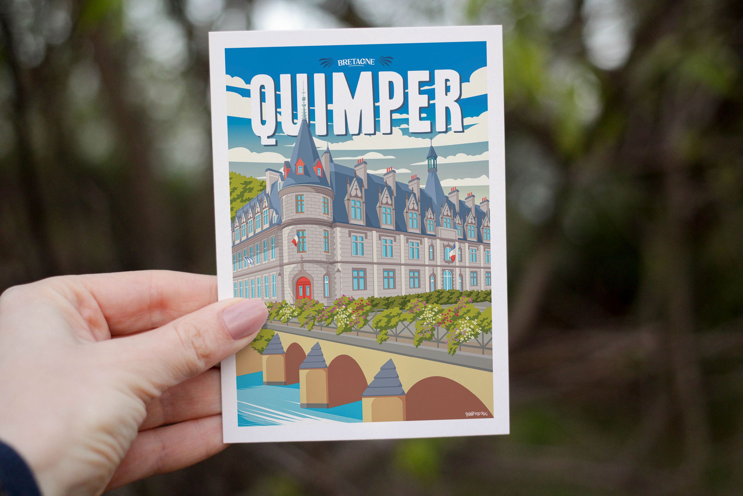 🏰 Quimper, c’est le bruissement discret de l’Odet, les maisons à pans de bois qui se penchent comme pour écouter, et les flèches élancées de la cathédrale Saint-Corentin qui découpent le ciel breton. Cette affiche néorétro capte l’âme de cette ville d’art et d’histoire, entre lumière granitique et culture enracinée. Pour tous ceux qui, à Quimper, entendent battre le cœur secret de la Bretagne vraie. 🎨