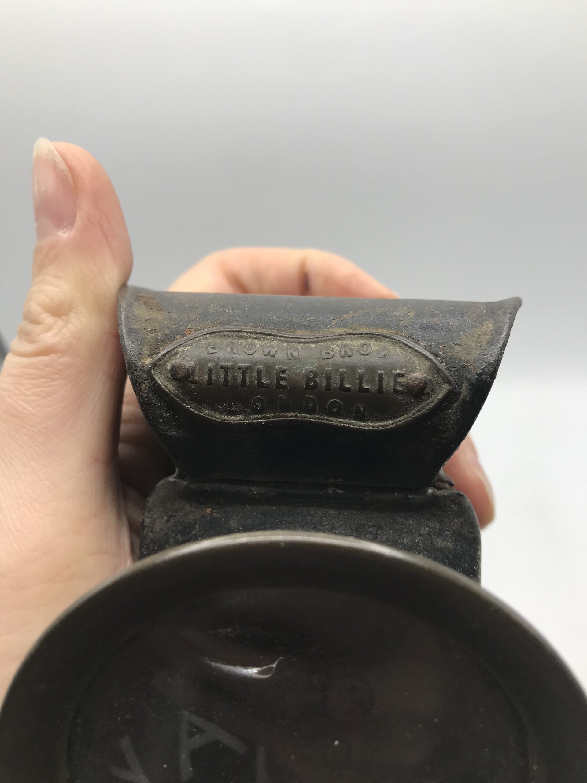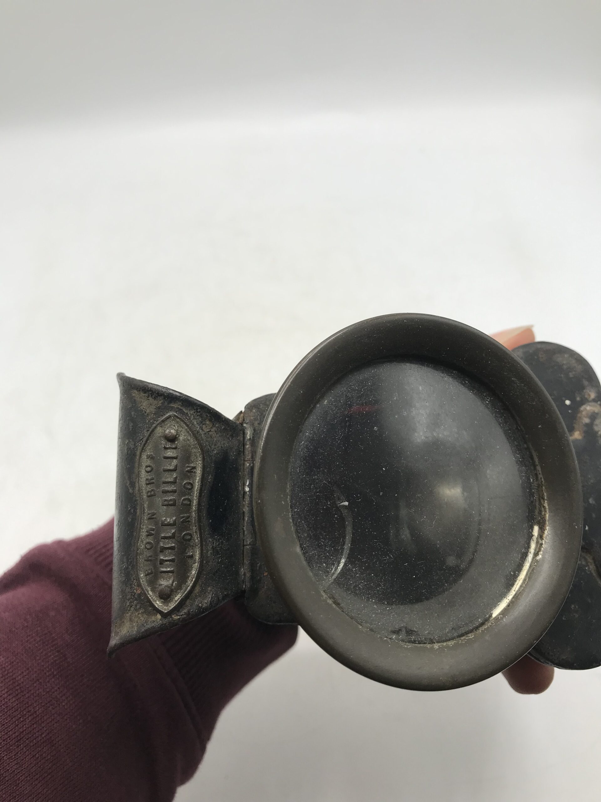 Alerte pépite !!! Ancienne lanterne à vélo des années 1920. Magnifique objet qu’est cette lanterne ancienne pour vélo. Elle est dans son jus, un bon nettoyage sera nécessaire pour la remettre en état. A noter la vitre de devant une une fissure (cf photos) mais les autres n’ont rien. Il est noté Brown Bros Little Billie London sur une plaque apposé sur la gauche. Bel objet ancien pour les collectionneurs et les fans de vélo. C’est le genre d’objet qui ne doit pas être enfoui ou obligé, avis aux fans de l’ancien et de ses inventions étonnantes pour l’époque. Cette lanterne aurait certainement beaucoup à nous raconter.