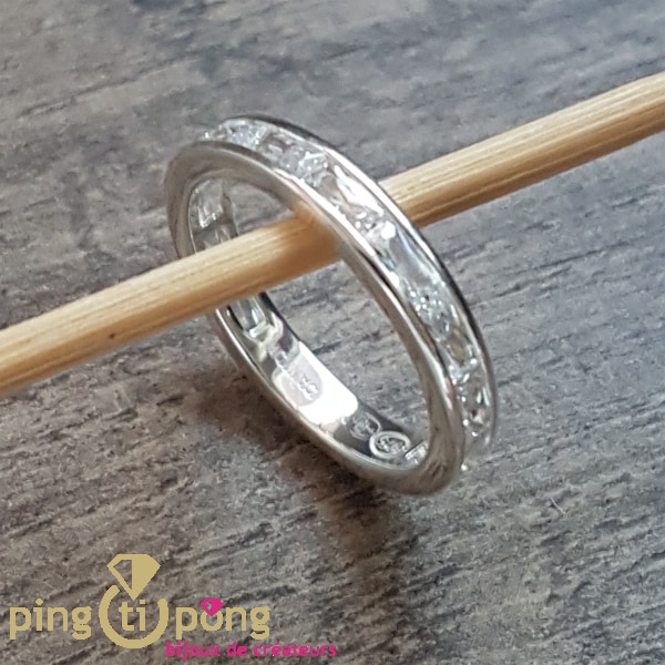 Superbe anneau en argent 925 serti de 12 cristaux d’oxyde blancs situés sur les 3/4 du tour.
