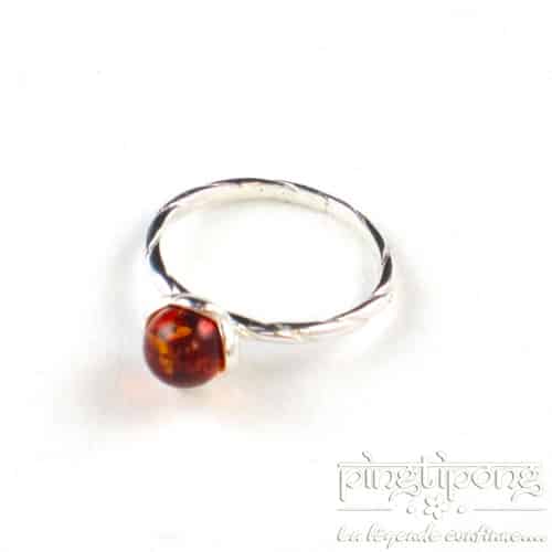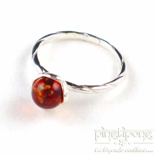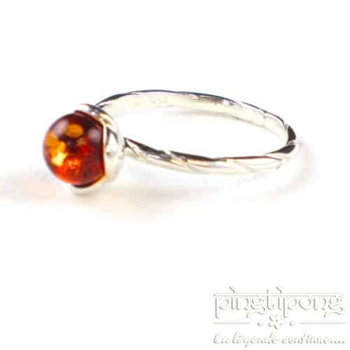 Le corps de la bague est en argent torsadé, le motif représente une fleur avec des pétales en argent et un centre en perle d’ambre orange cognac.