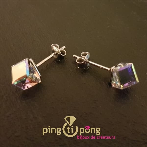 Chacune de ces belles boucles d’oreilles puces en forme de cube d’environ 6 mm est réalisée avec le cristal de Swarovski le plus beau. D’un éclat hors du commun, la beauté du cristal de Swarovski égale ici certaines pierres précieuses.