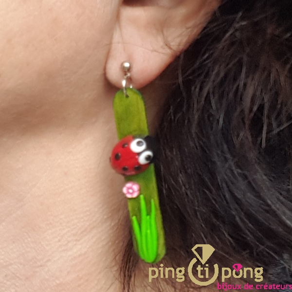 Boucles pendantes fantaisie très originales, fabriquées en France près de Lyon, ces boucles d’oreilles de la collection « Ma Nature » en bois et pâte Fimo® présentent une petite coccinelle dans la prairie.