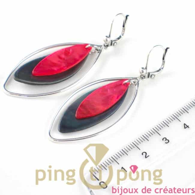 Boucles d’oreilles en nacre avec un sequi principal gris et un petiti rose montées sur dormeuses de forme pétale ou olive.