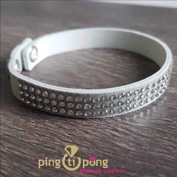 Ce bijou en alcantara « peau de pêche » et cristaux de luxe de marque Spark est constitué d’une lanière en alcantara blanc dans laquelle sont incrustés 3 lignes de cristaux blancs.