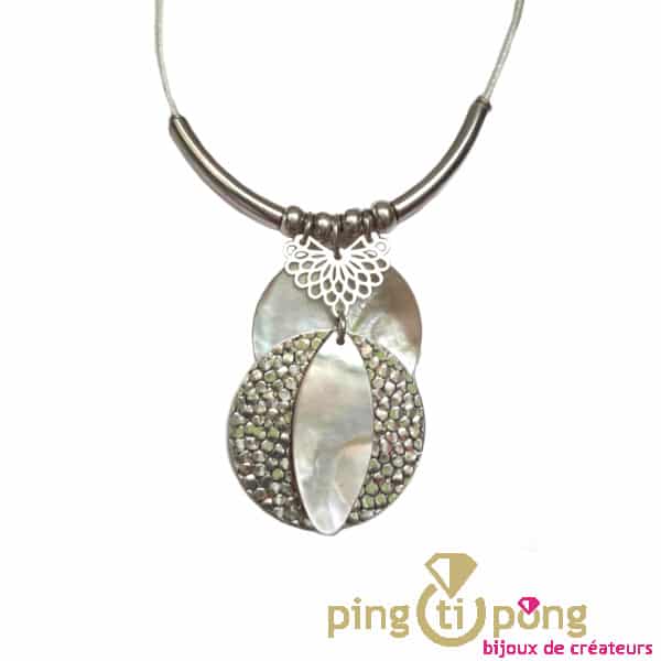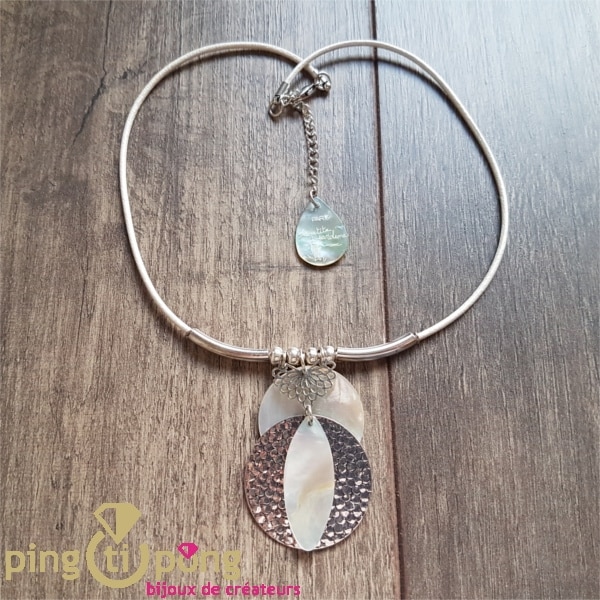 Lien en cuir ciré, médaillon en nacre blanche, pétale en nacre blanche et médaille en métal argenté martelé agrémenté d’un décor dentelé en métal argenté.