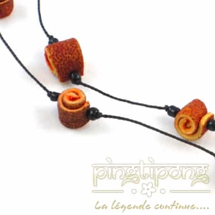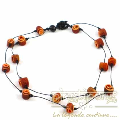 La peau d’orange utilisée est stabilisée et teintée, elle est ensuite utilisée comme matière première pour être mise ne forme. ici ce sont de petits rouleaux qui sont associés à des perles noires qui donnent ce joli collier.