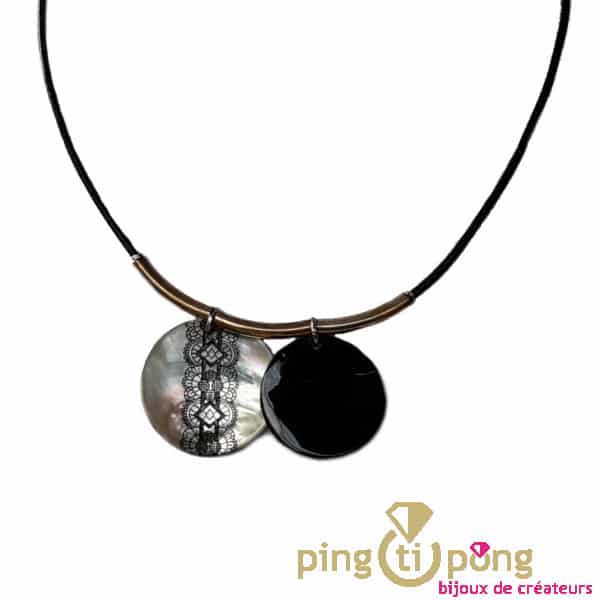 En cuir ciré, ce bijou original présente une base en métal argenté orné de deux médaillons de nacre dont l’un est sérigraphié d’un motif dentelle.