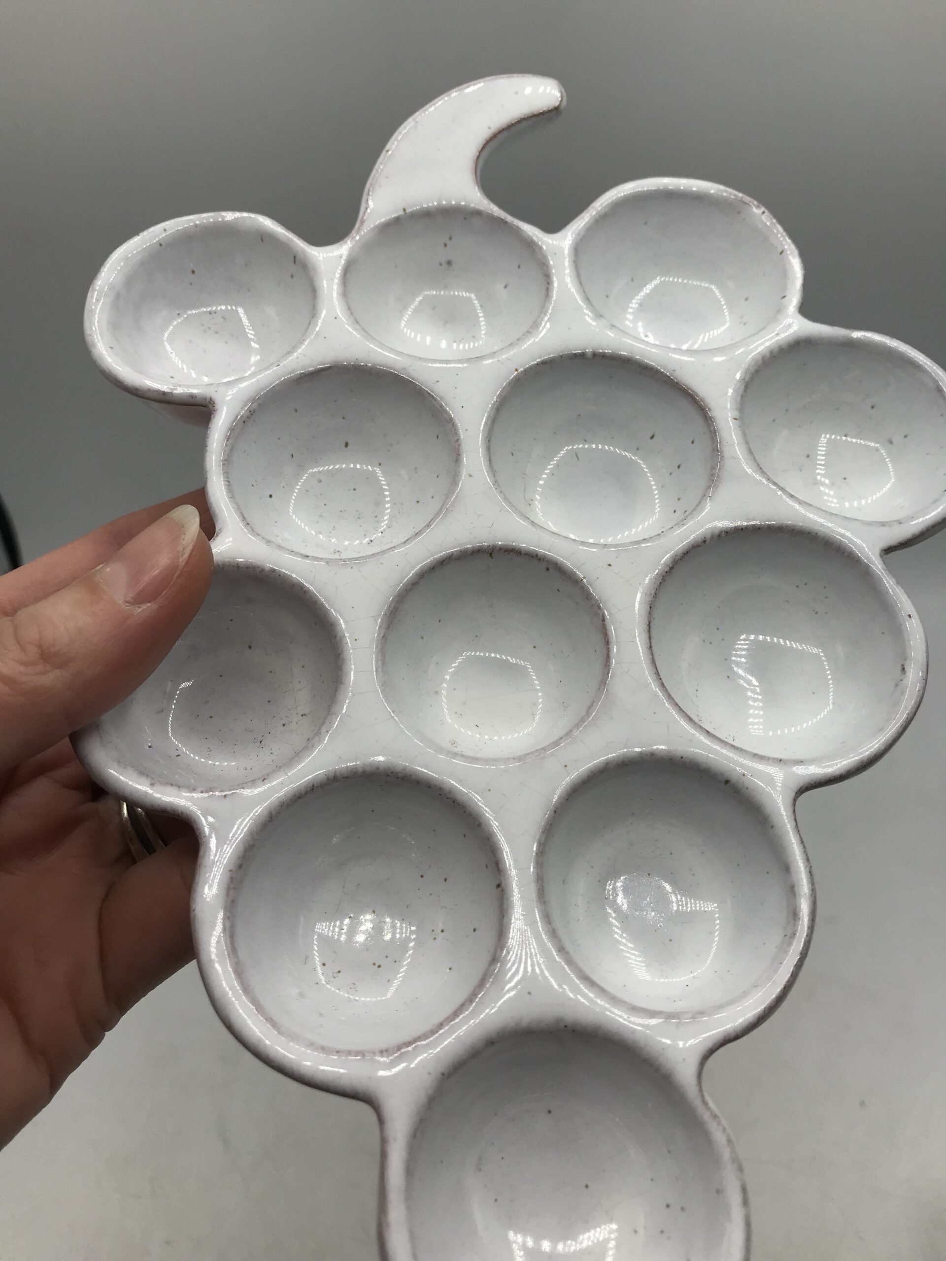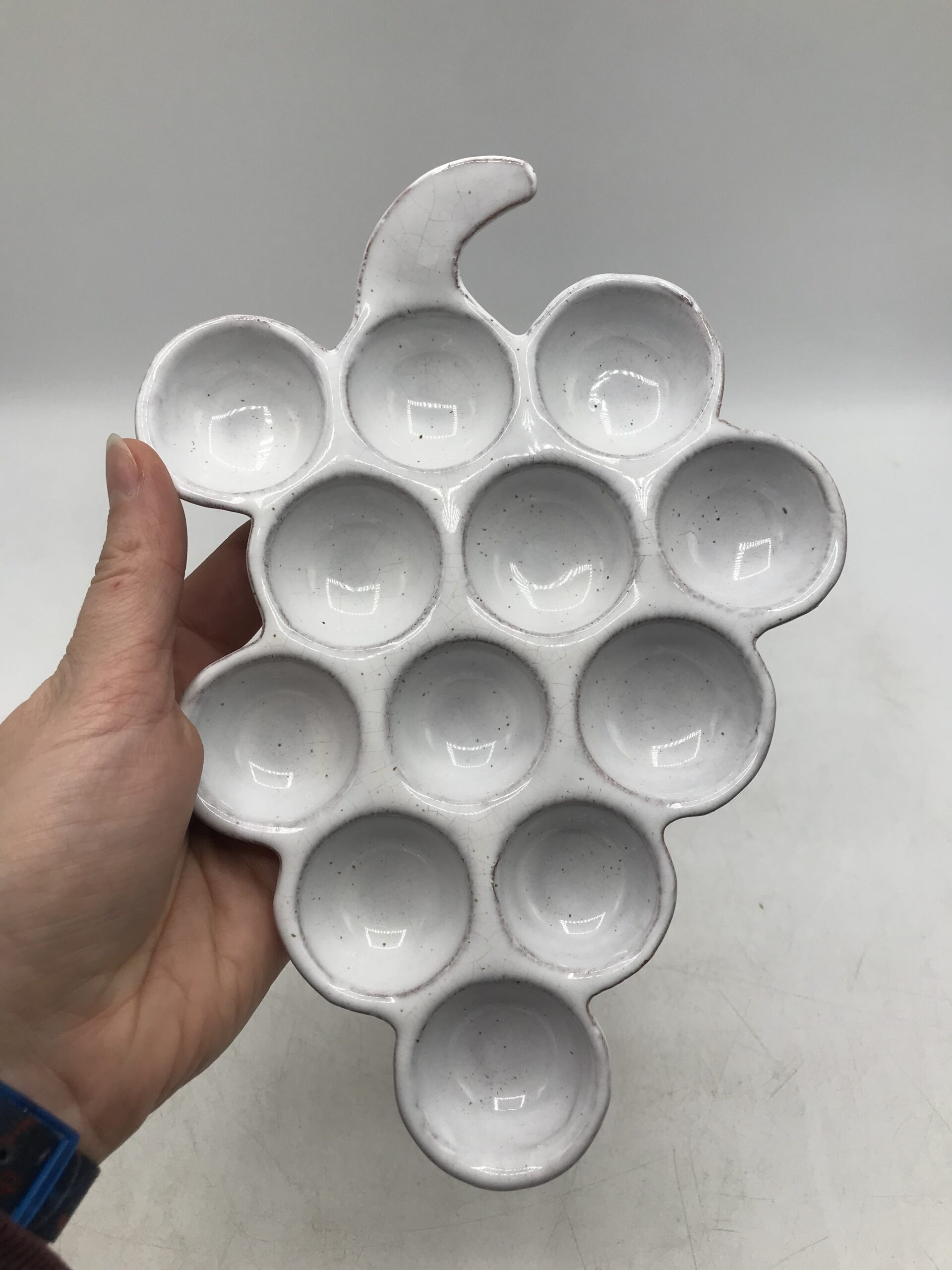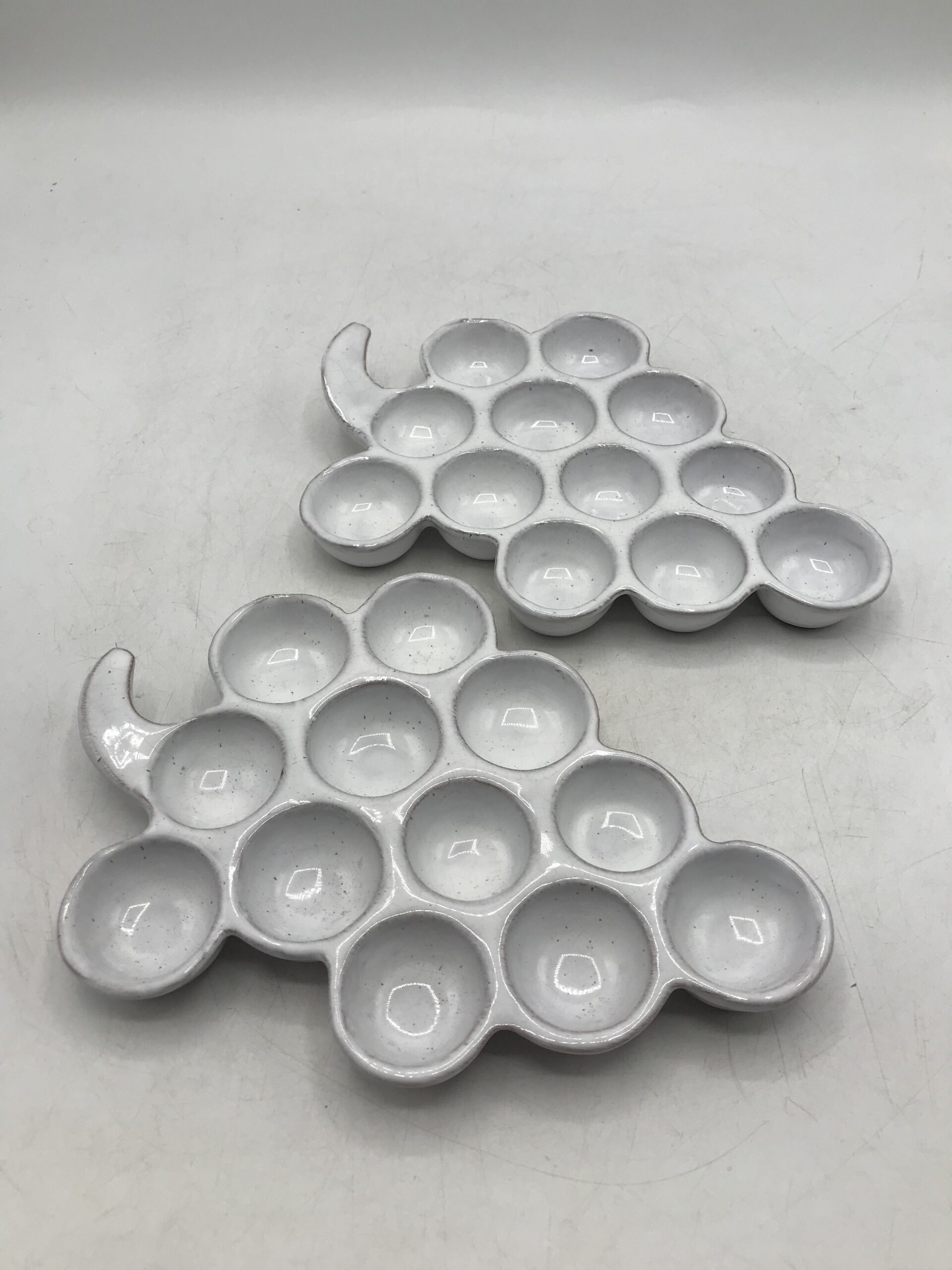 Deux ranges œufs Vallauris « Raisin ». Très belles coupelles en forme de grappes de raisins en céramique. Deux pièces signées Vallauris, apportez une touche d’originalité dans votre rangement. Les grappes contiennent 12 emplacements, de quoi faire de belles réserves. Elles sont en très bon état pas de casse. De couleur crème avec de légères pigmentation marron, elles ne manquent pas de caractère. Amoureux des créations Vallauris et des pièces originales vous ne serez pas déçus. Envie d’une petite omelette apportez votre grappe prés du feu. Une belle seconde vie les attend.