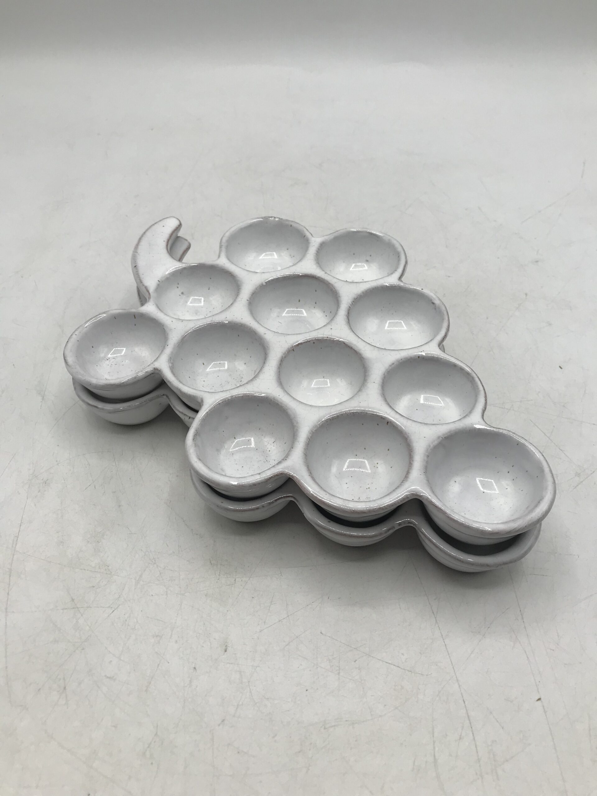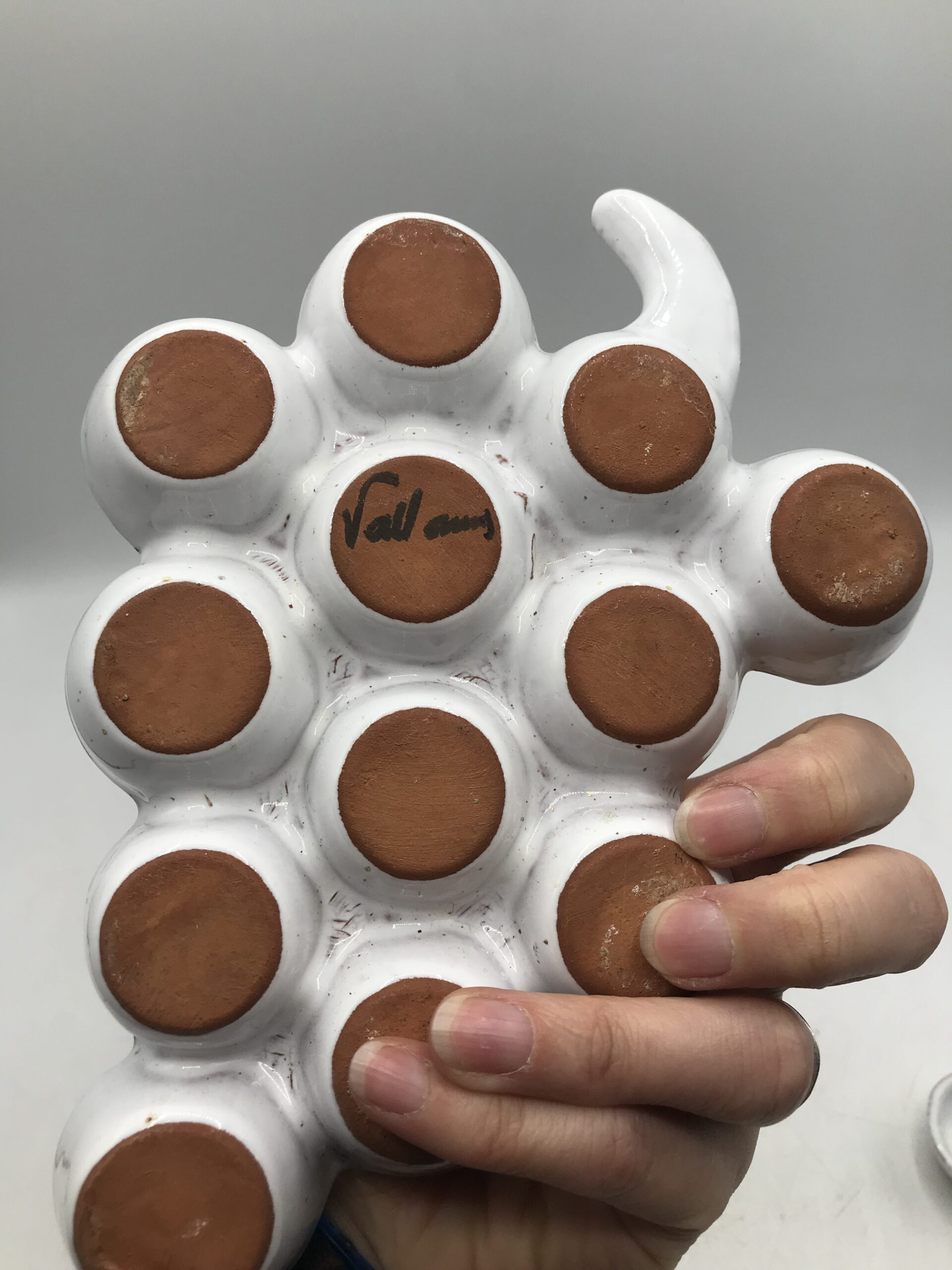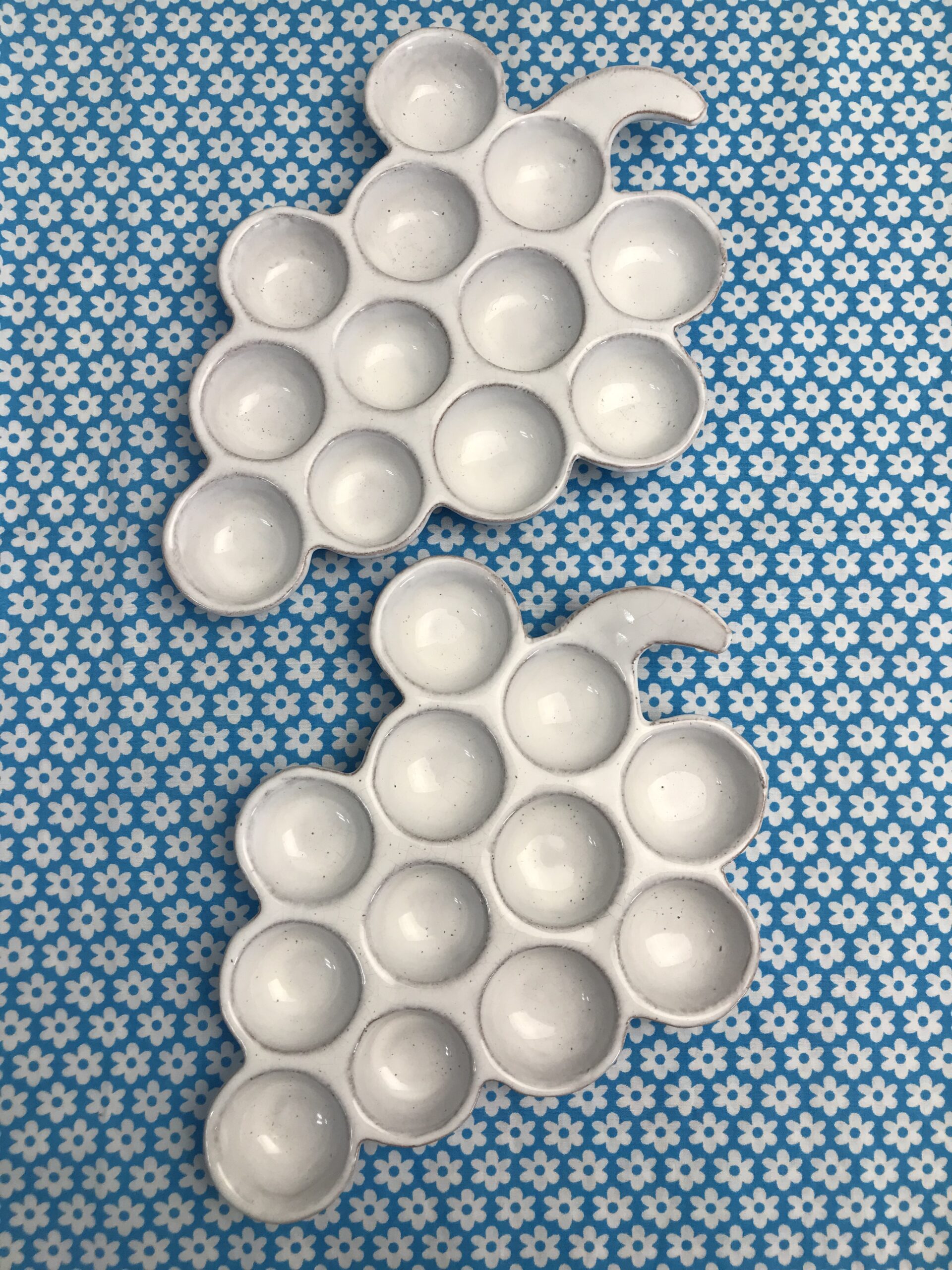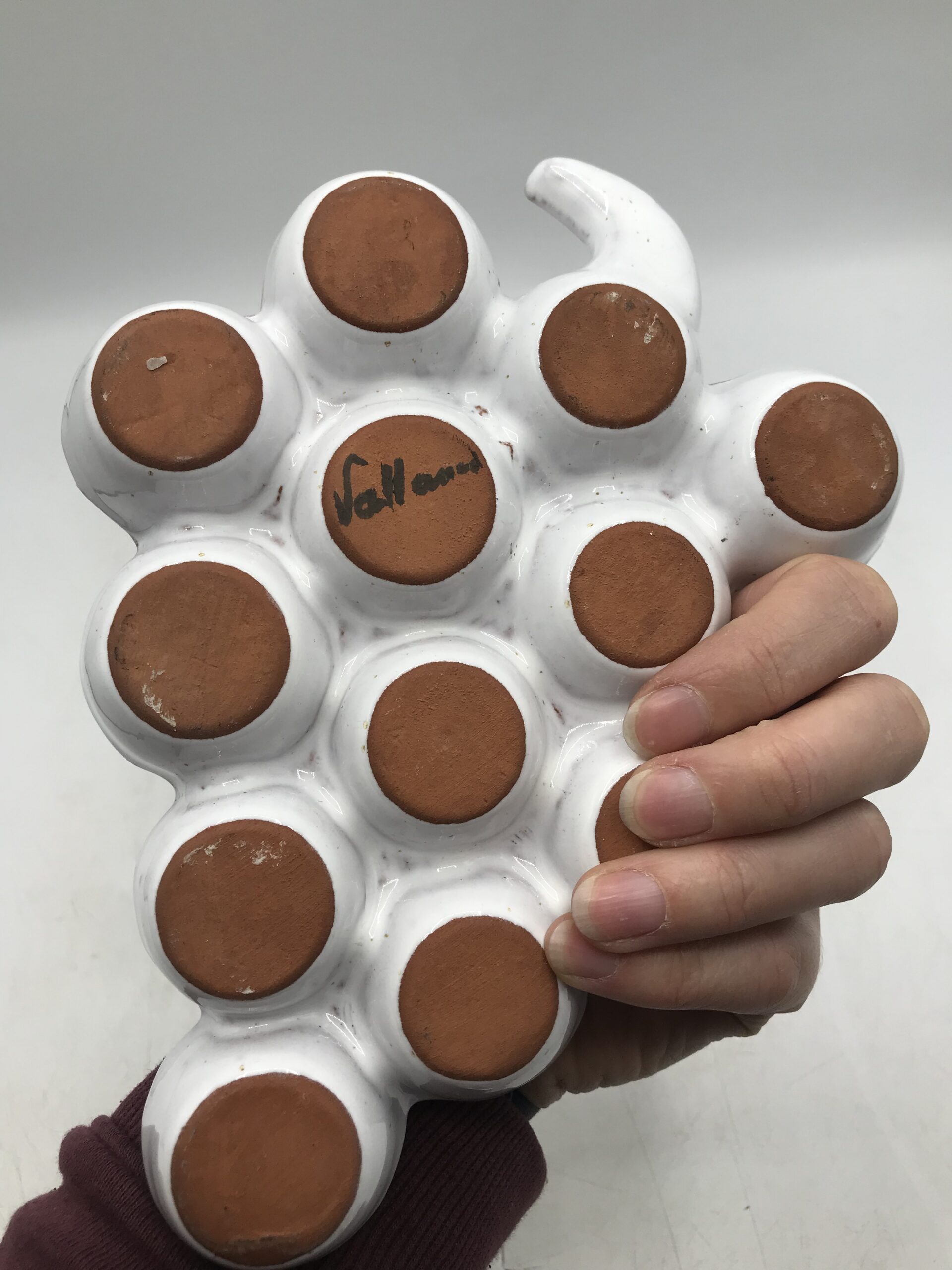 Deux ranges œufs Vallauris « Raisin ». Très belles coupelles en forme de grappes de raisins en céramique. Deux pièces signées Vallauris, apportez une touche d’originalité dans votre rangement. Les grappes contiennent 12 emplacements, de quoi faire de belles réserves. Elles sont en très bon état pas de casse. De couleur crème avec de légères pigmentation marron, elles ne manquent pas de caractère. Amoureux des créations Vallauris et des pièces originales vous ne serez pas déçus. Envie d’une petite omelette apportez votre grappe prés du feu. Une belle seconde vie les attend.