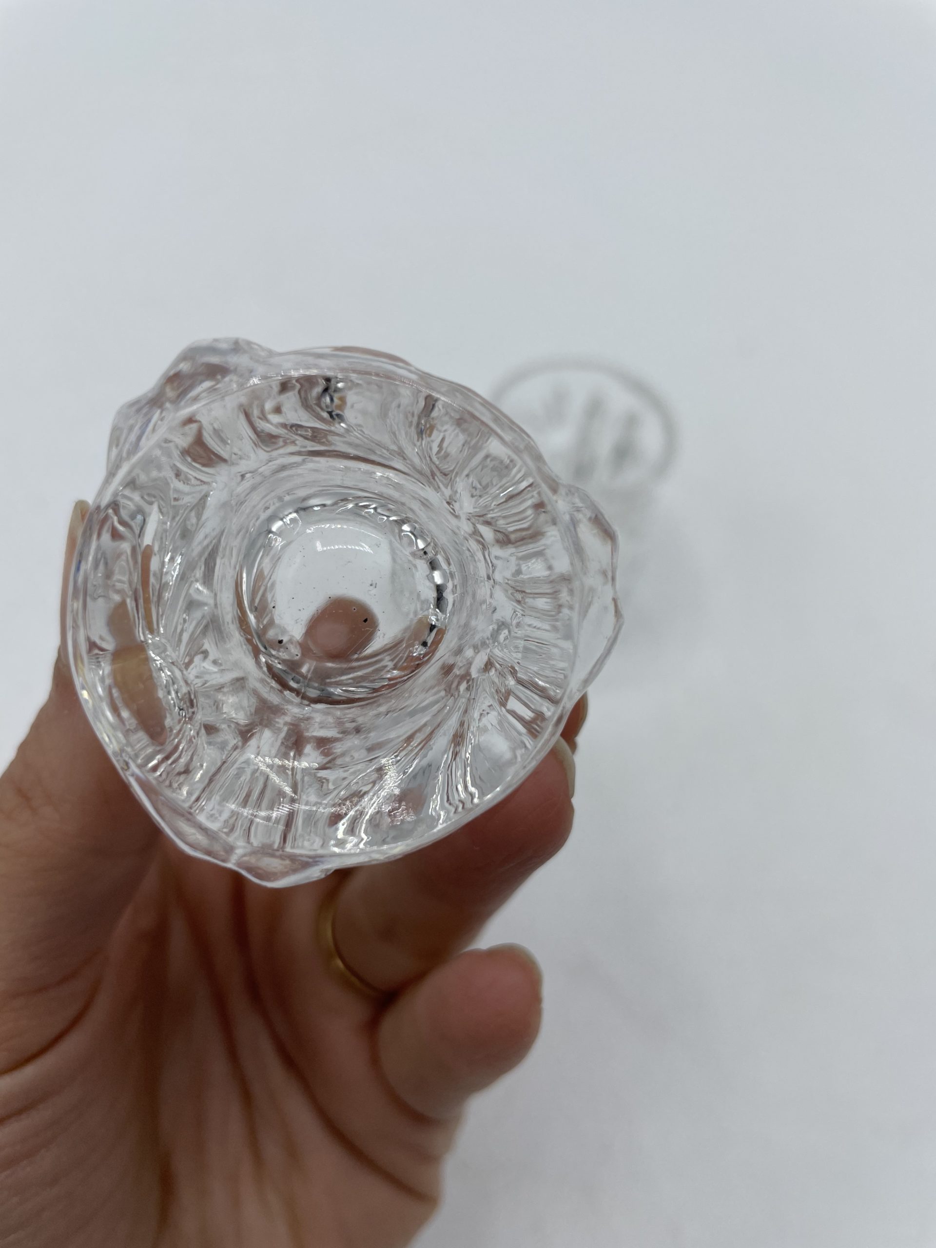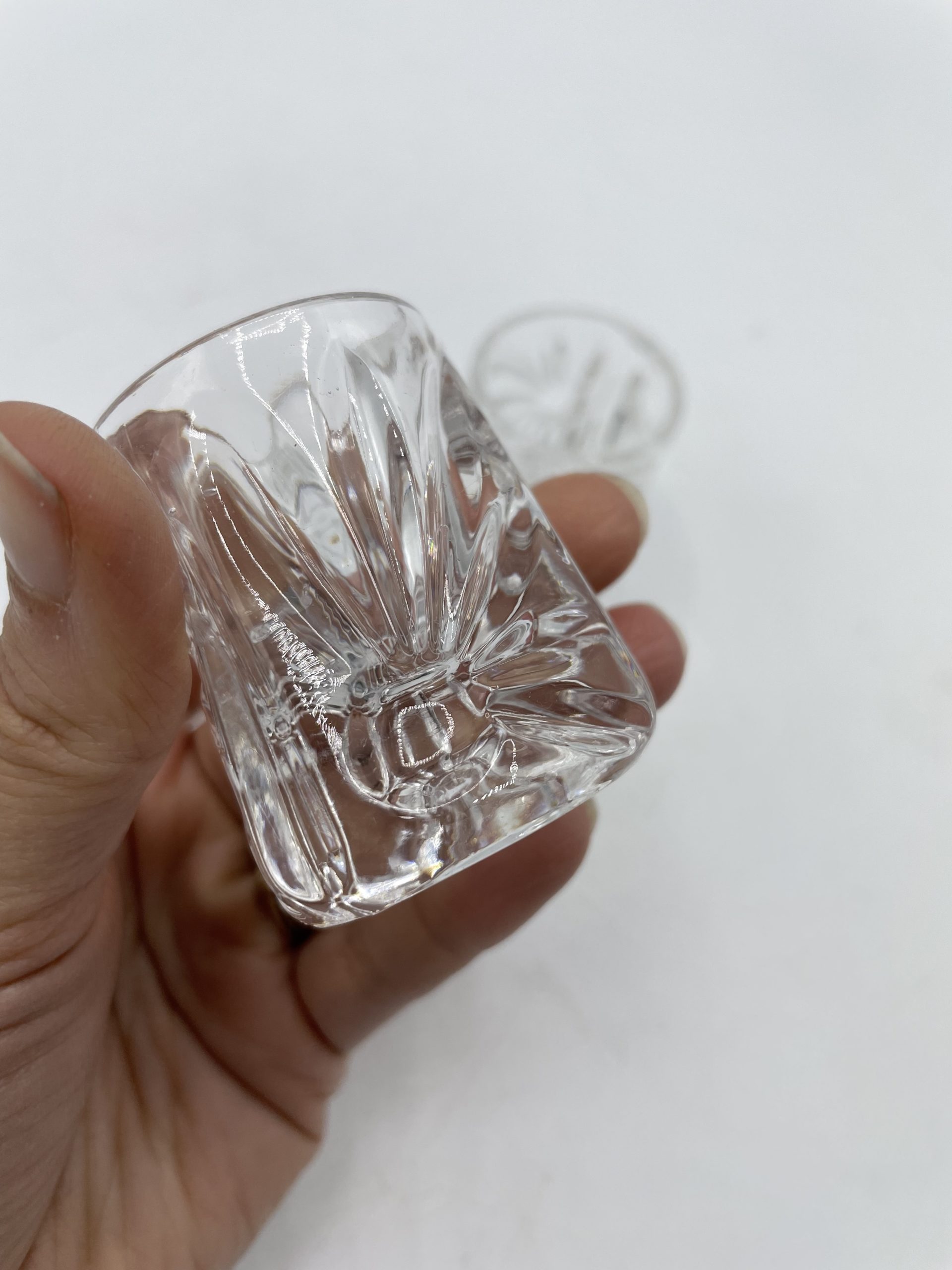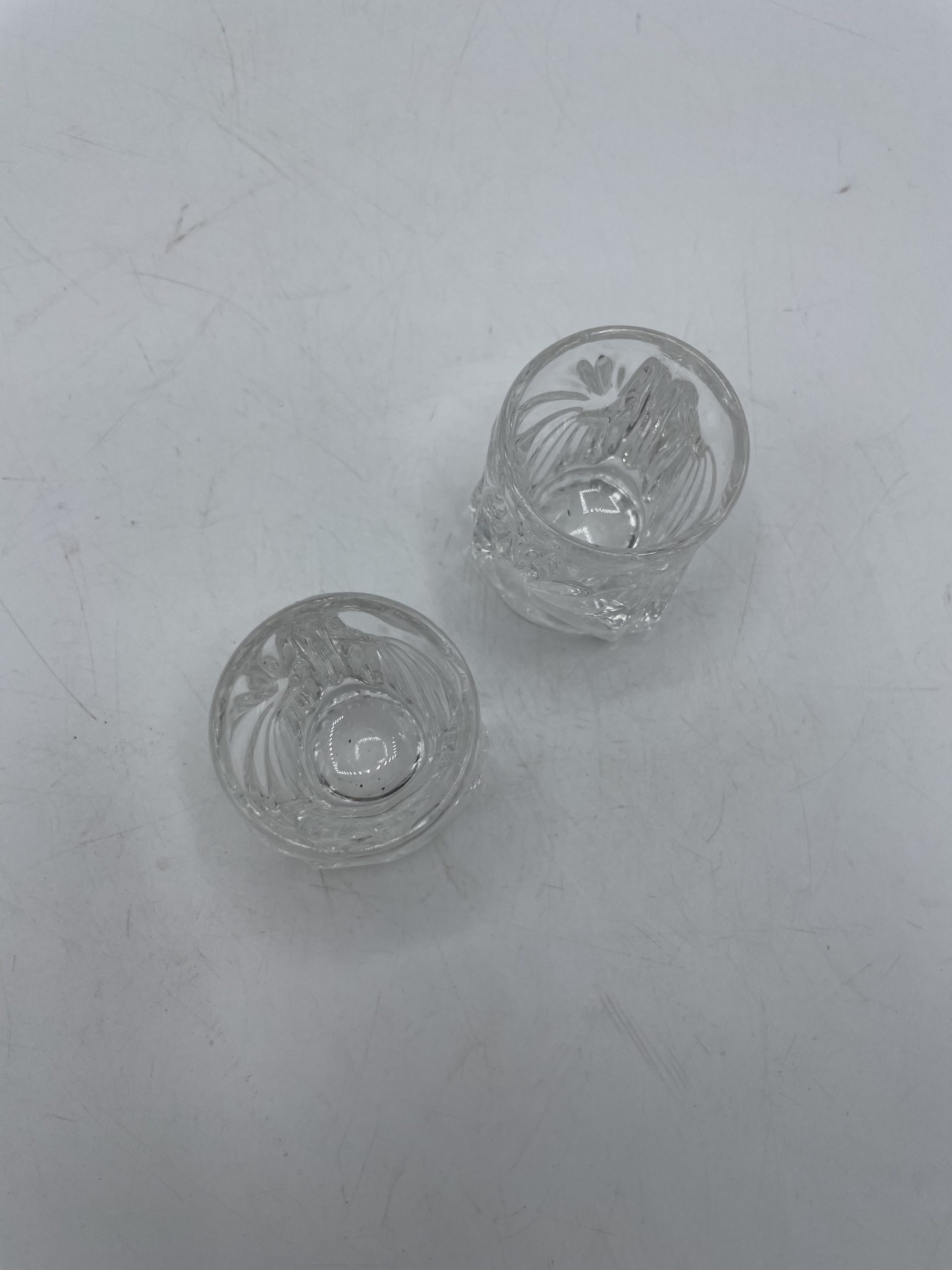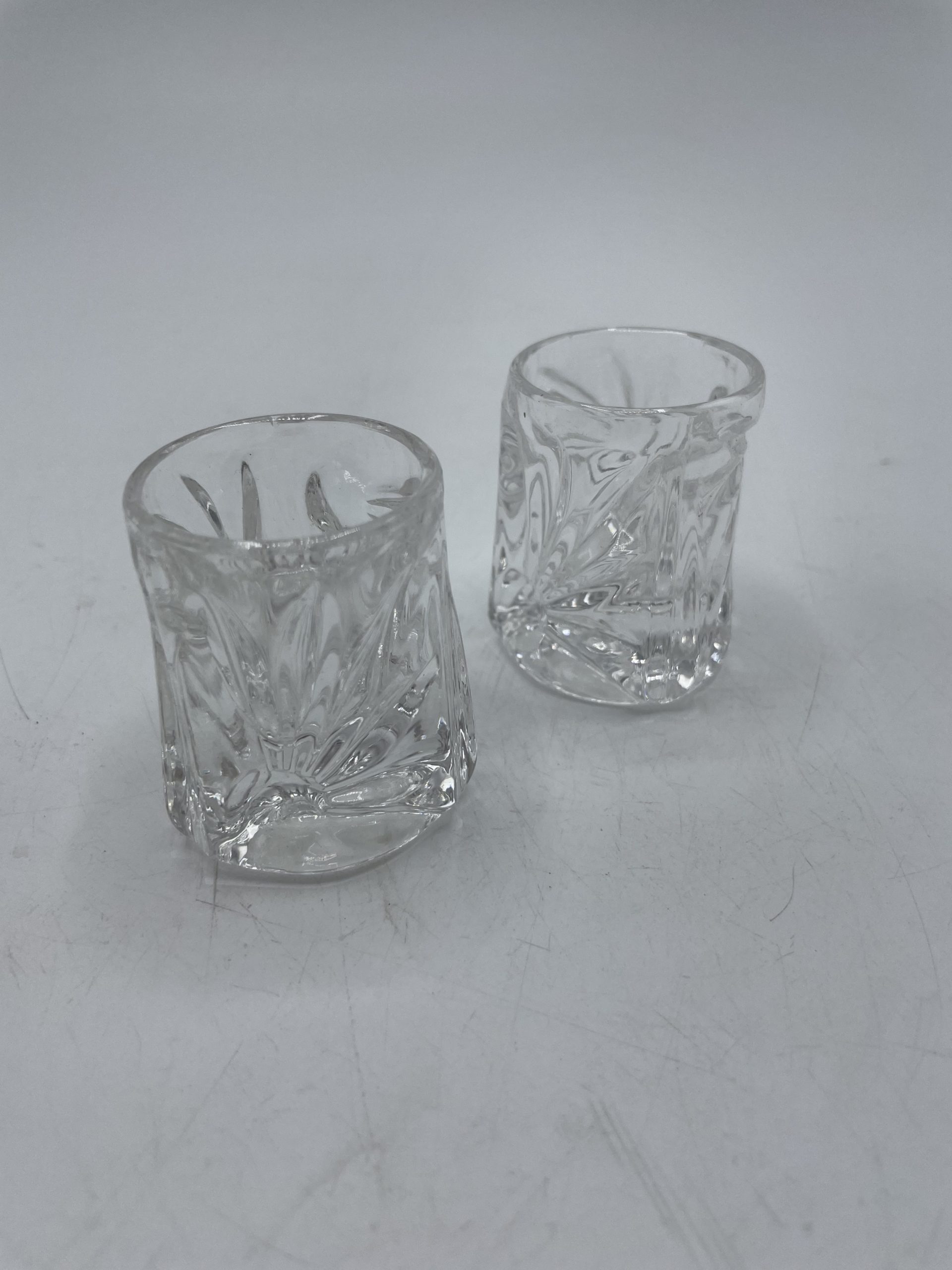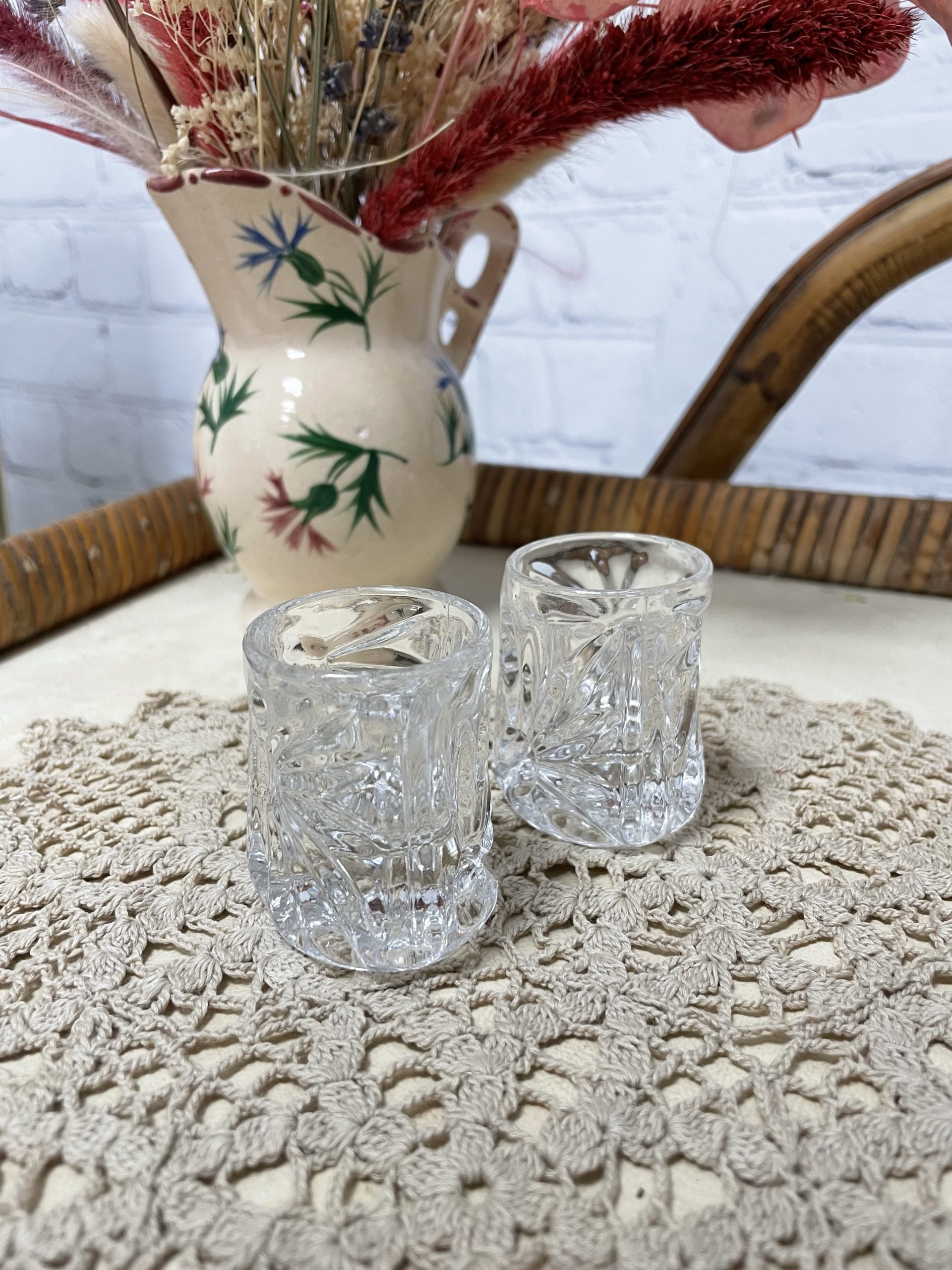 On craque d’amour pour ce joli duo de deux petits verres à shot. En verre ciselé, les verres ont une jolie fore entre le rond et la pyramide et ils sont décorés de décors de marguerites taillés sur chaque face. Un jolis duo plein de charme idéal pour déguster une liqueur ou une eau-de-vie ou détourné en mini bougeoirs !