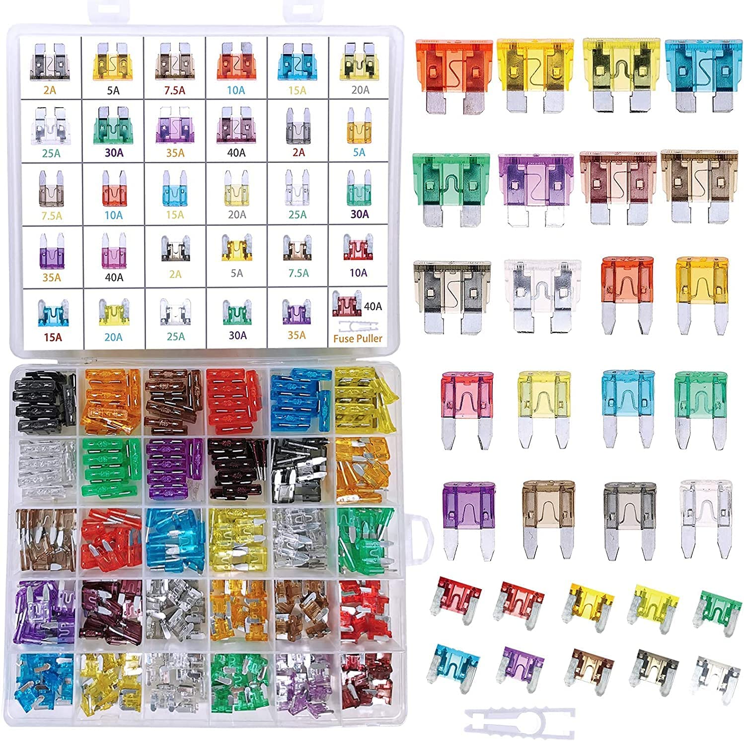 Jeu de 340 fusibles de voiture, fusibles de voiture standard et mini et à profil bas Fusibles à lame 2A 5A 7,5A 10A 15A 20A 25A 30A 35A 40A ATC/APR/ATO+ATM, avec 1 extracteur de fusible