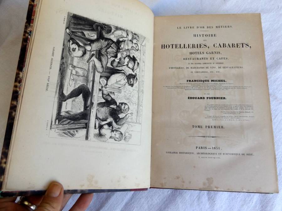 MICHEL, Francisque – FOURNIER, Edouard : « Le livre d’or des métiers. Histoire des hôtelleries, cabarets, hôtels garnis, restaurants et cafés, et des anciennes communautés et confréries d’hôteliers, de marchands de vins, de restaurateurs, de limonadiers. Tome 1 et 2. »