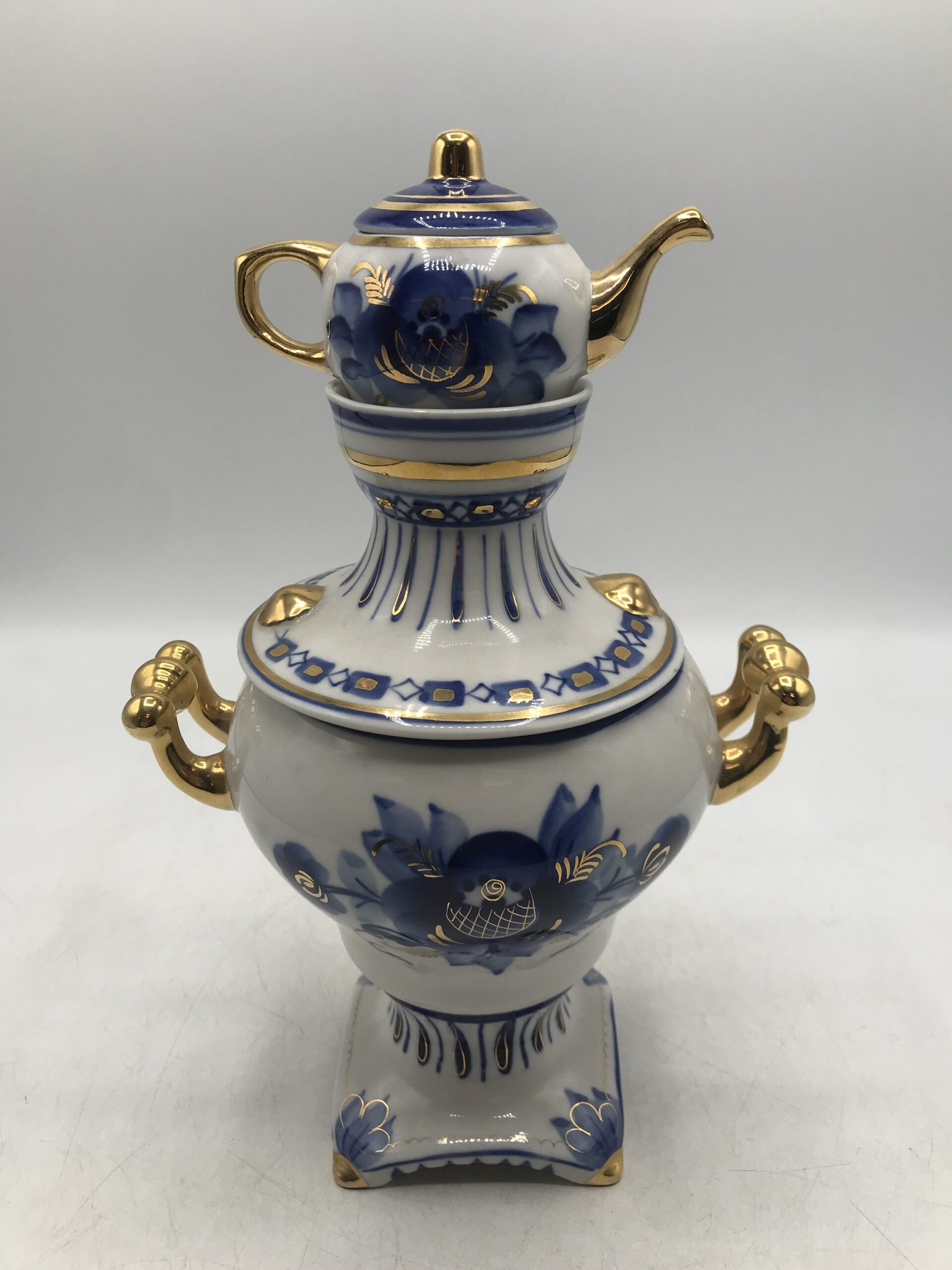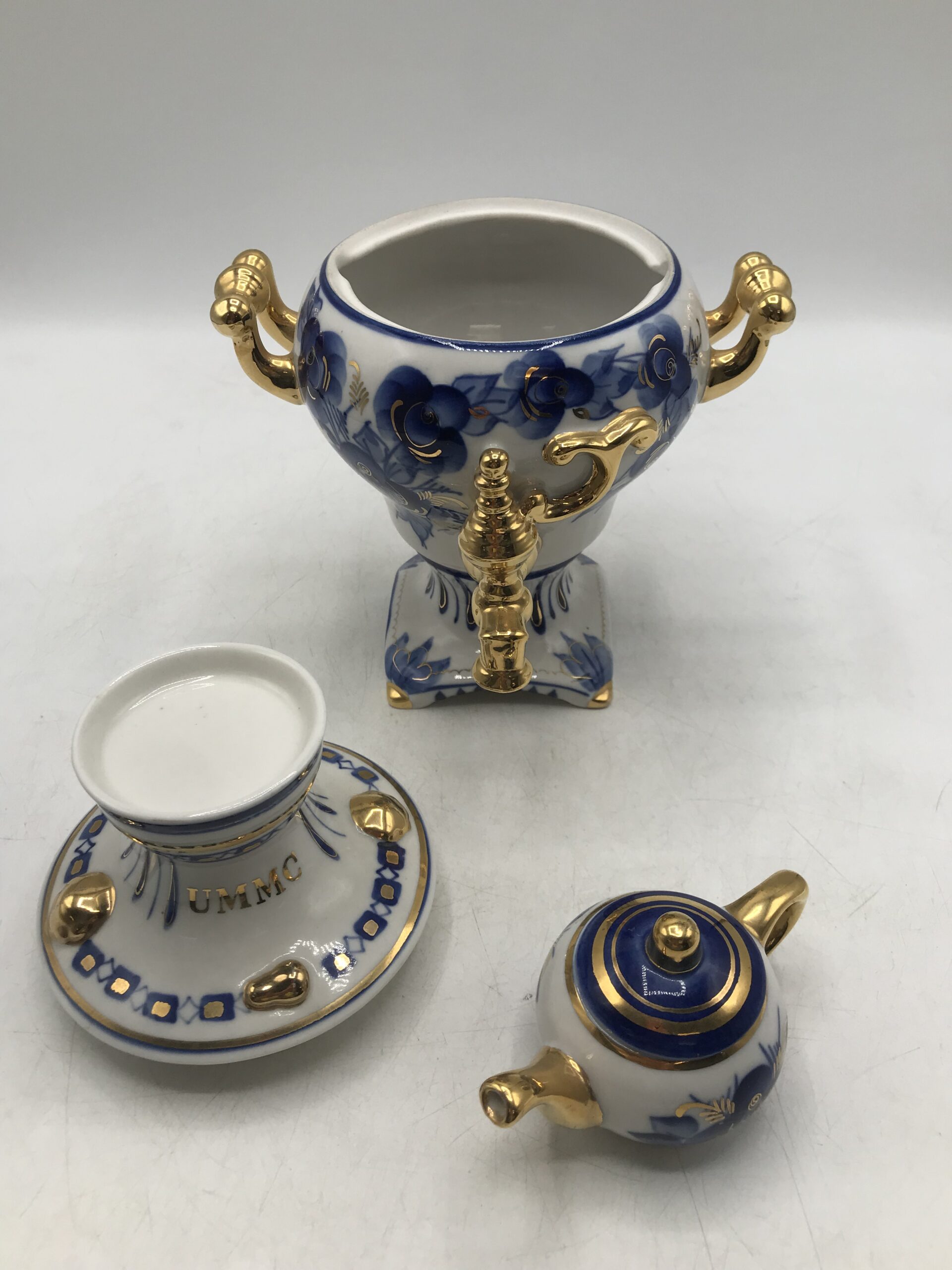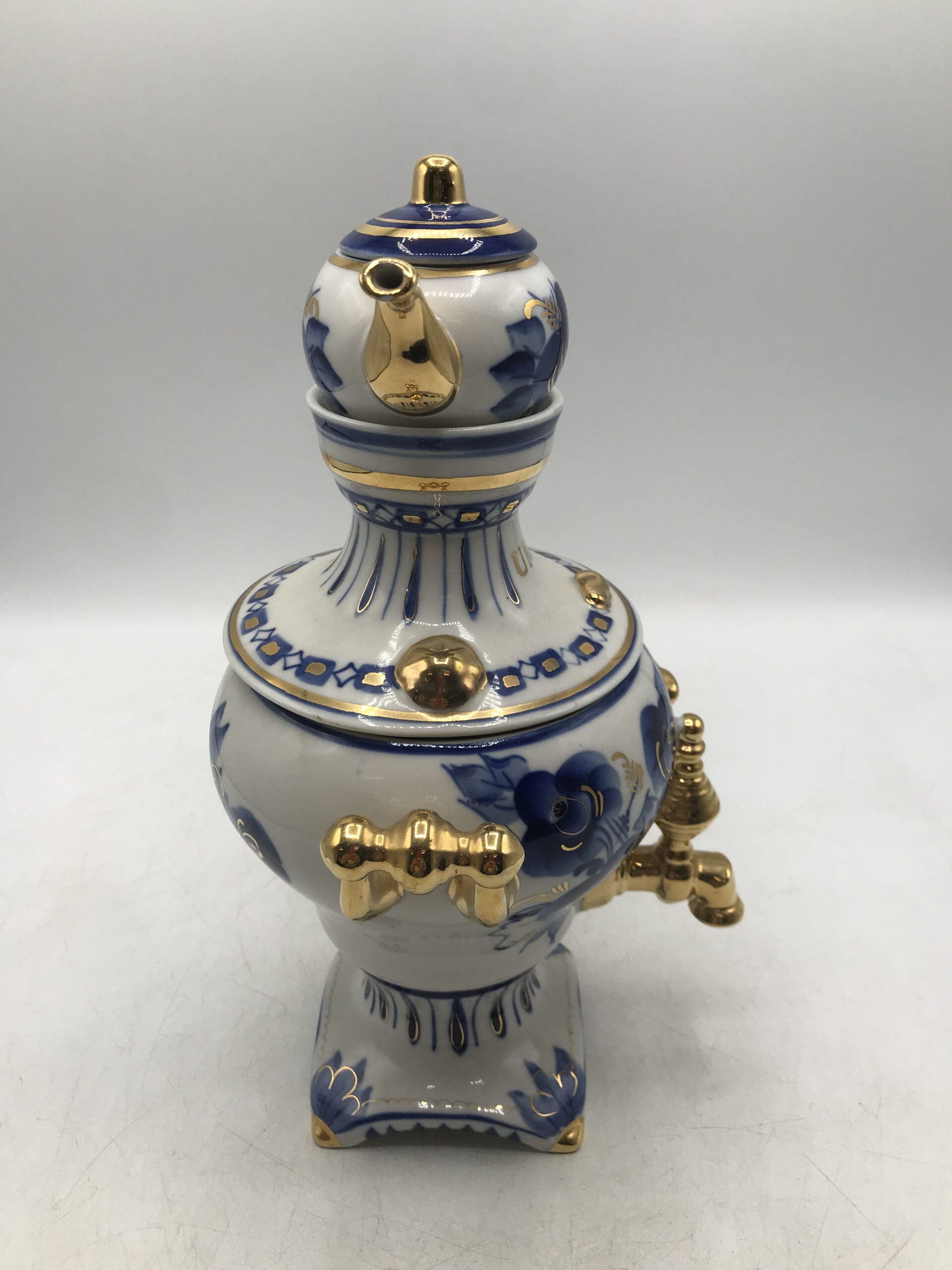Samovar Russe en porcelaine. Petit samovar d’origine Russe en porcelaine. Il est en parfait état rien à dire (cf photos). Il est composé de trois parties, une partie qui est le socle avec le petit robinet, une couvercle et une mini théière en haut. Bel objet de décoration pour un style marqué. Il est de couleur blanc avec des motifs floraux bleu et or. Une invitation au voyage et à l’évasion. Amoureux de la Russie il représente bien sont savoir faire en porcelaine. Une petite note de rococo et de clinquant sans détours. Surprenez vos invités et agrémenter votre décoration intérieure.