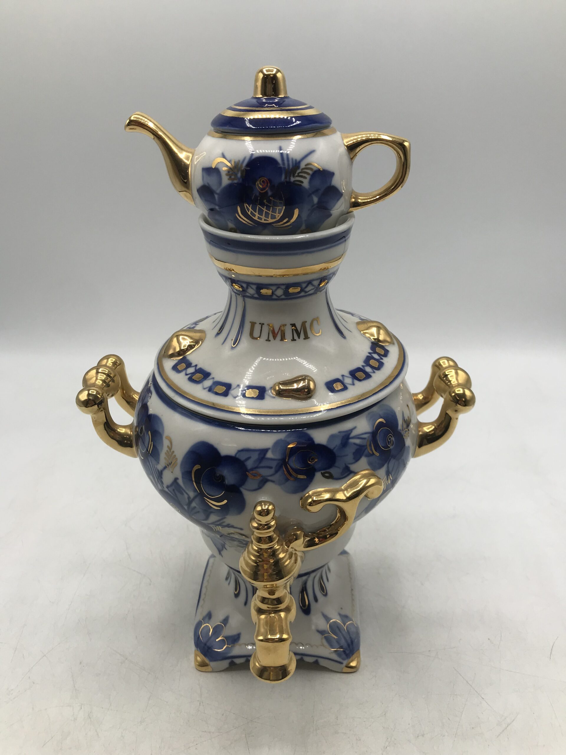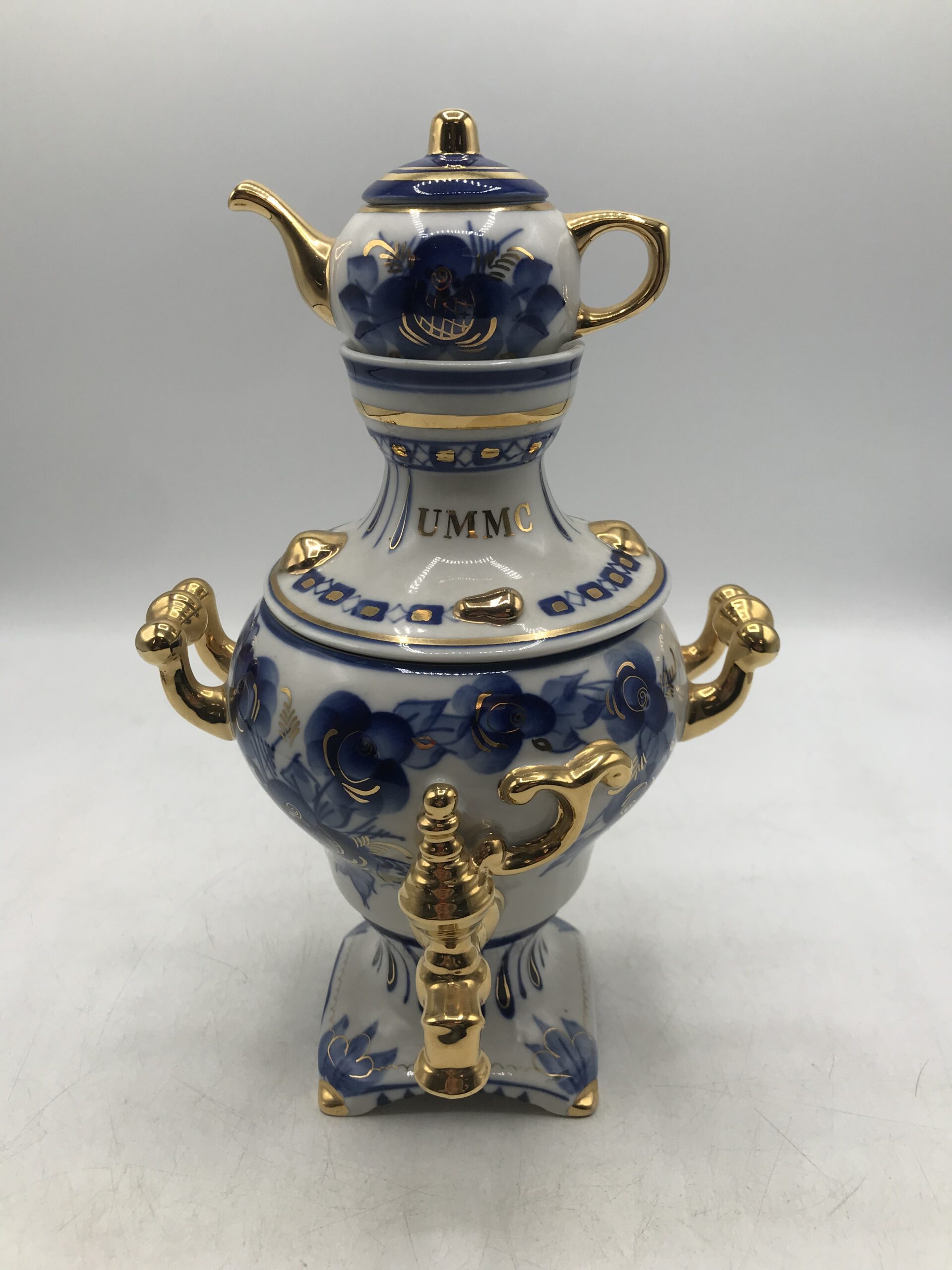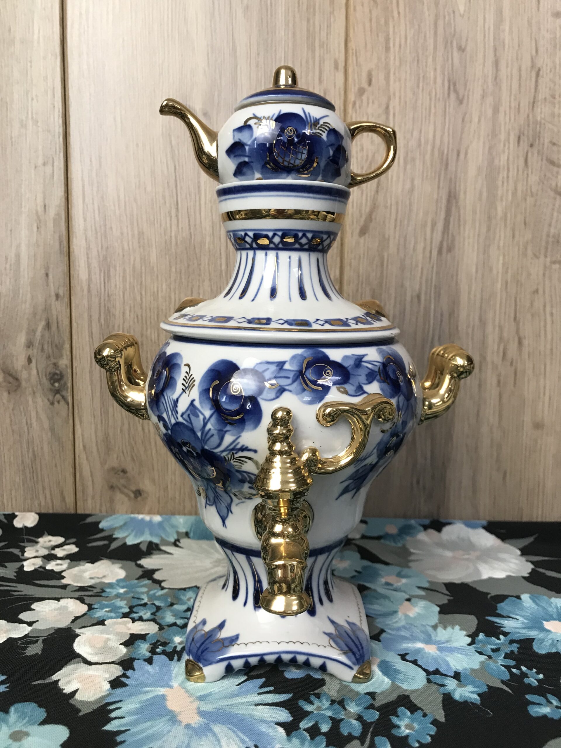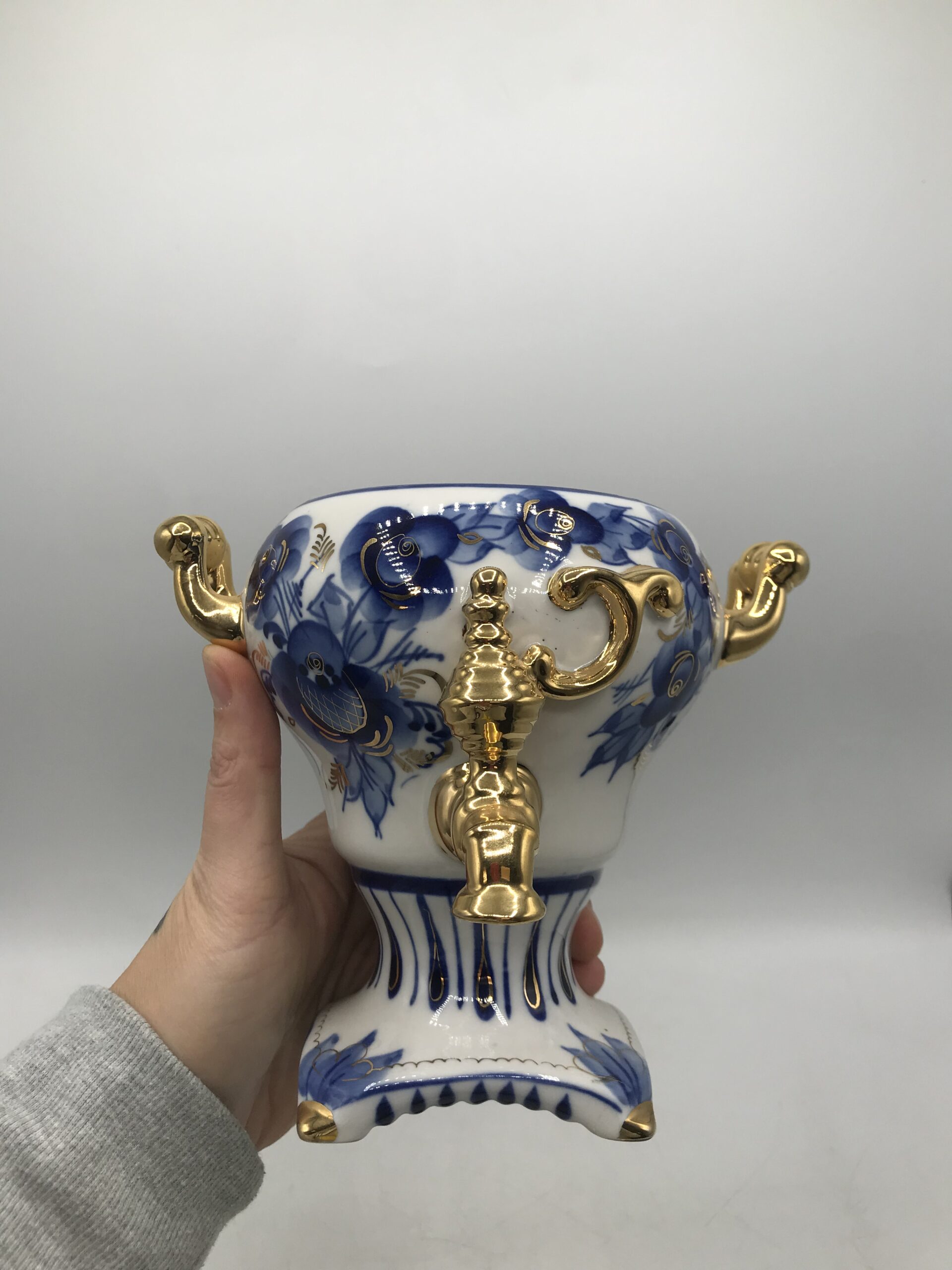 Samovar Russe en porcelaine. Petit samovar d’origine Russe en porcelaine. Il est en parfait état rien à dire (cf photos). Il est composé de trois parties, une partie qui est le socle avec le petit robinet, une couvercle et une mini théière en haut. Bel objet de décoration pour un style marqué. Il est de couleur blanc avec des motifs floraux bleu et or. Une invitation au voyage et à l’évasion. Amoureux de la Russie il représente bien sont savoir faire en porcelaine. Une petite note de rococo et de clinquant sans détours. Surprenez vos invités et agrémenter votre décoration intérieure.