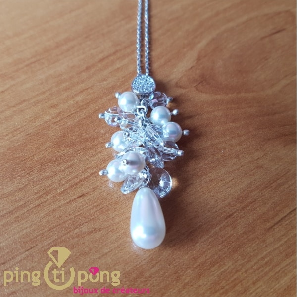 Très luxueux sautoir du créateur SPARK, composé d’une chaînette en argent 925 et d’un pendentif comprenant plusieurs cristaux de Swarovski blancs et diamant ainsi que des perles.
