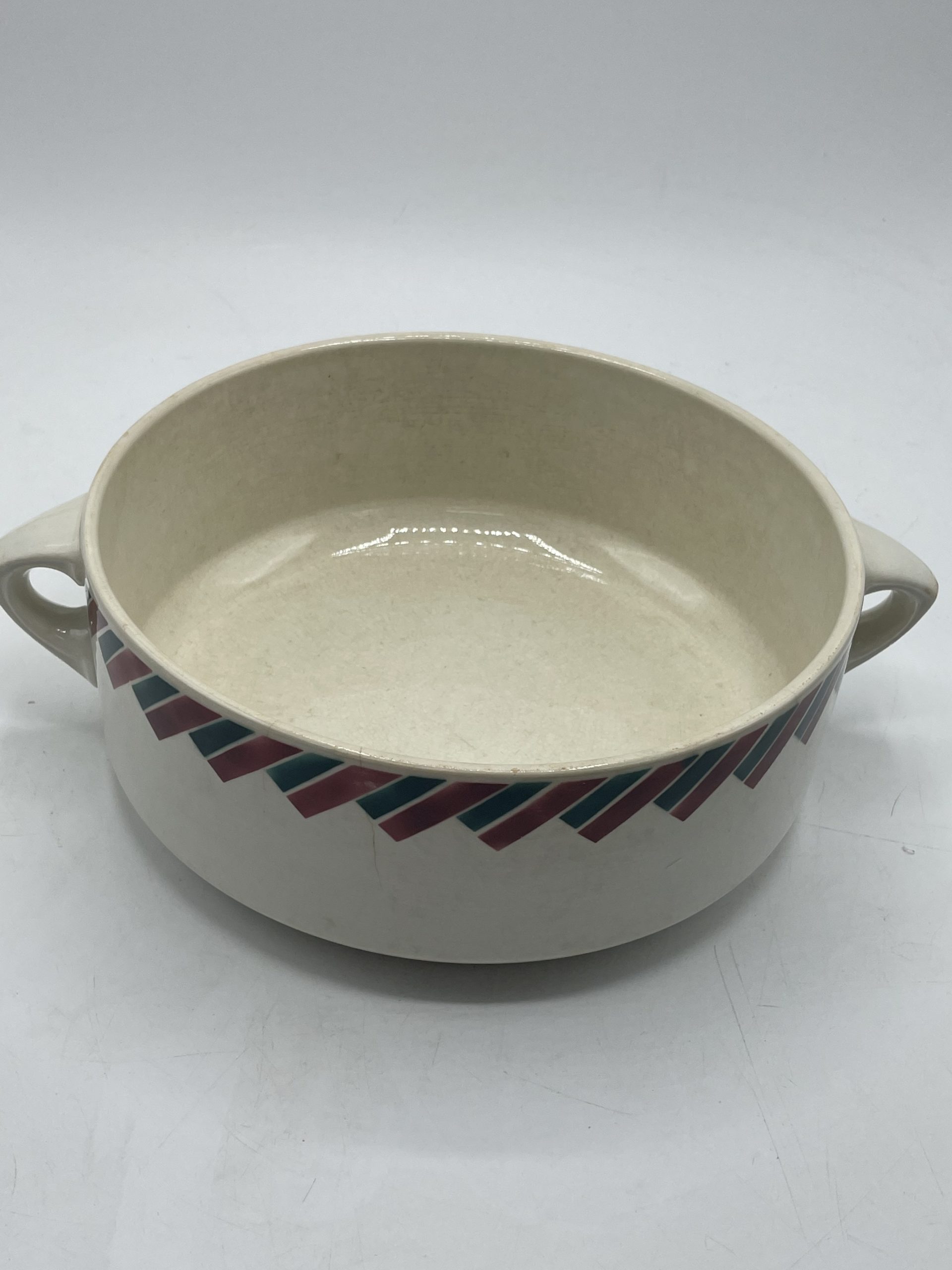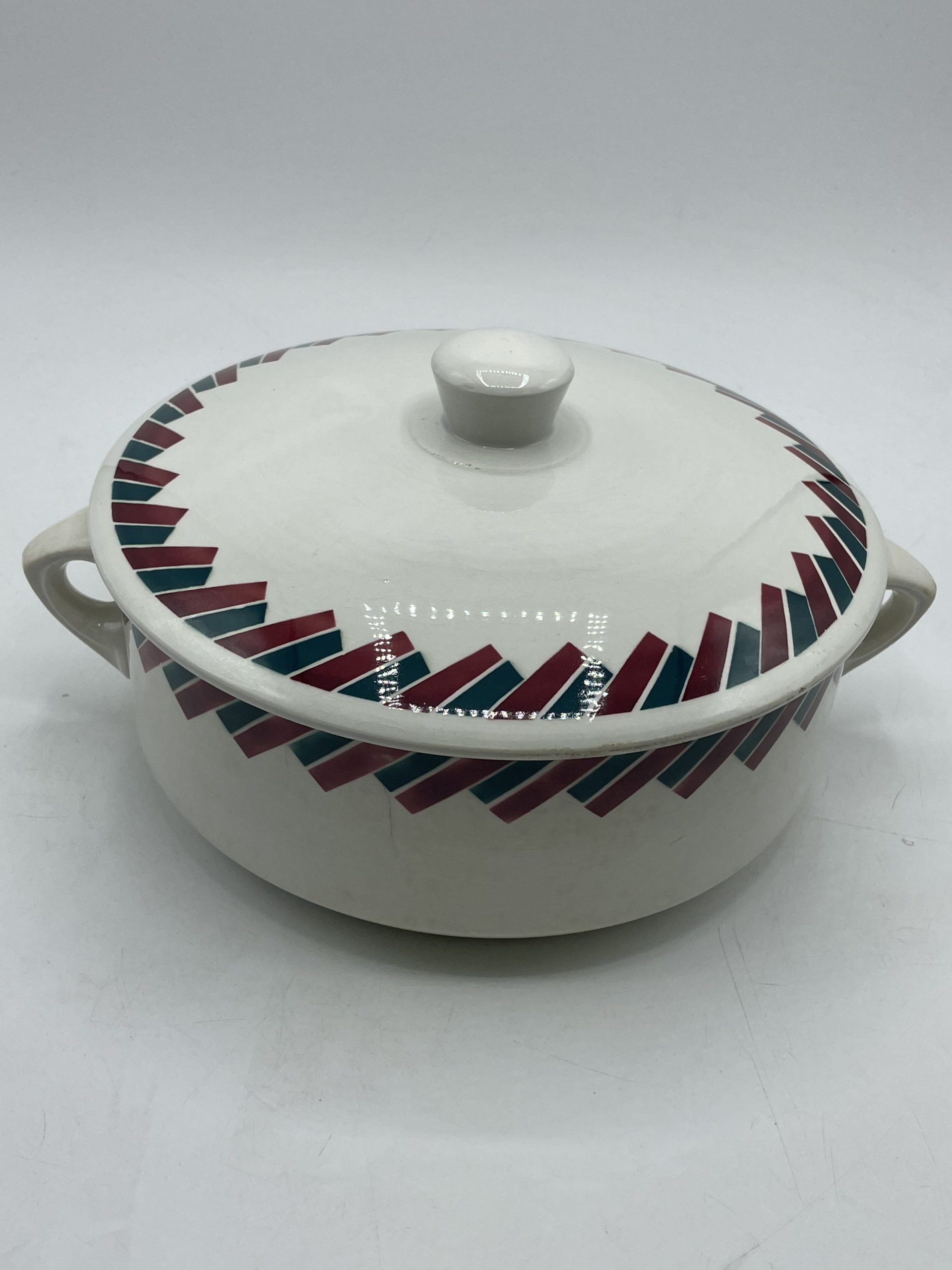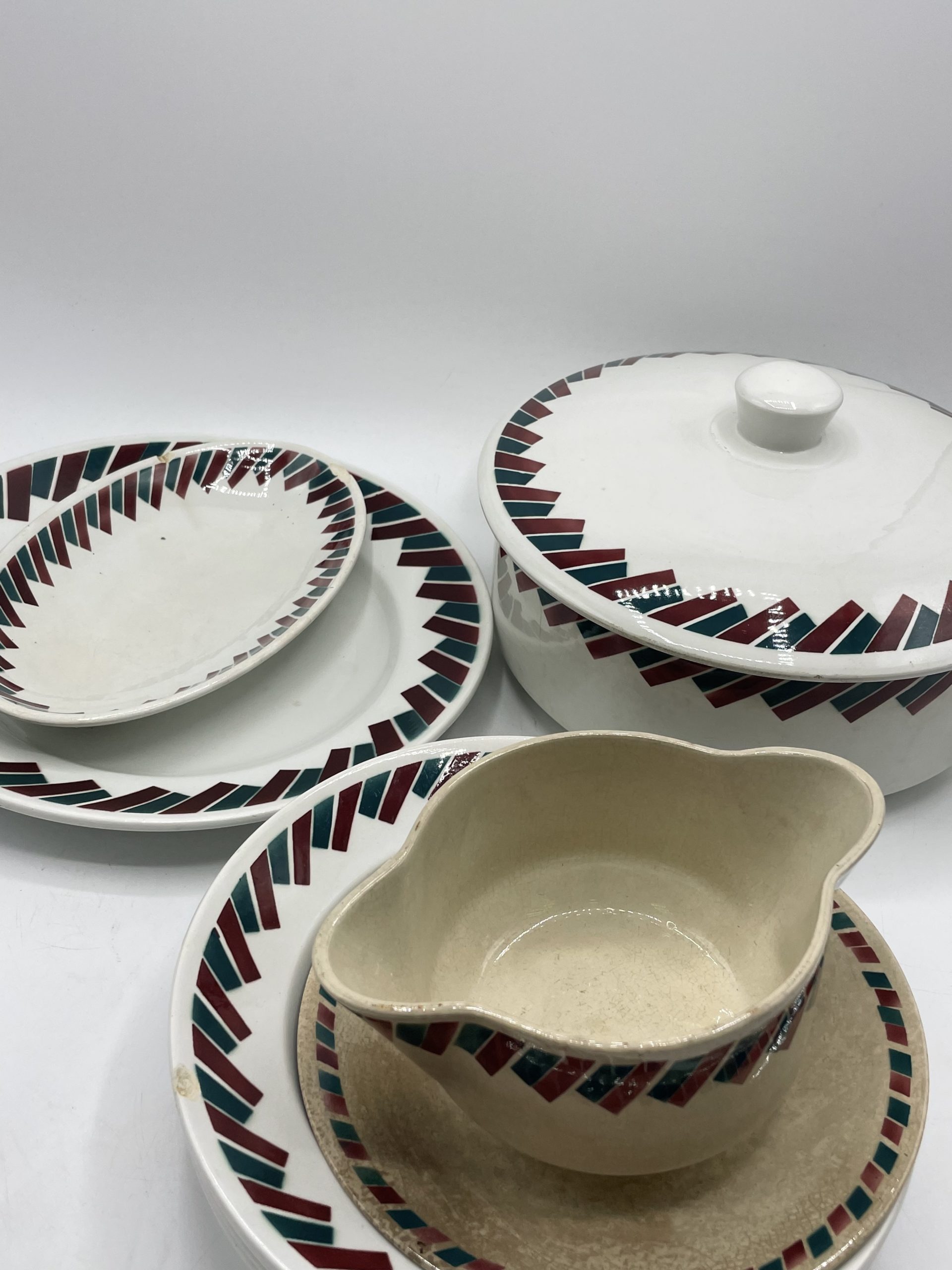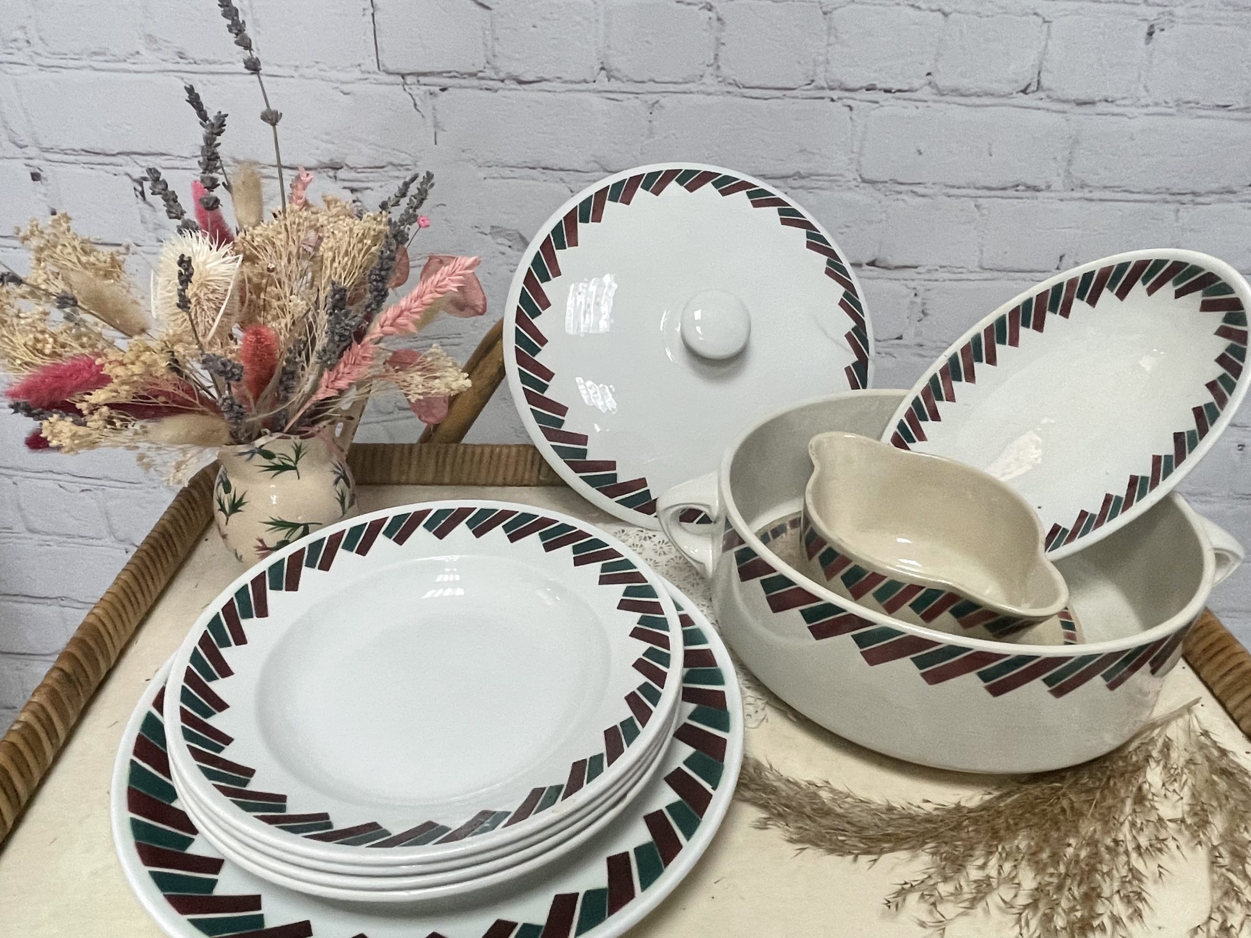 Amoureux de vaisselle vintage, ce joli service de 8 pièces se compose d’1 soupière, d’1 plat de service, d’1 saucier, d’1 ravier et de 4 assiettes creuses. Estampillé Badonviller France, le service en faïence fait partie de la collection Dupleix. De couleur blanche, il est décoré de motifs de rectangles posés en frise de couleur bordeaux et vert sapin. Vintage, des traces d’usure, fêles et éclats sont à prévoir (cf photos) jolies marques du temps passé. Un beau service à collectionner idéal pour une bonne soupe maison !