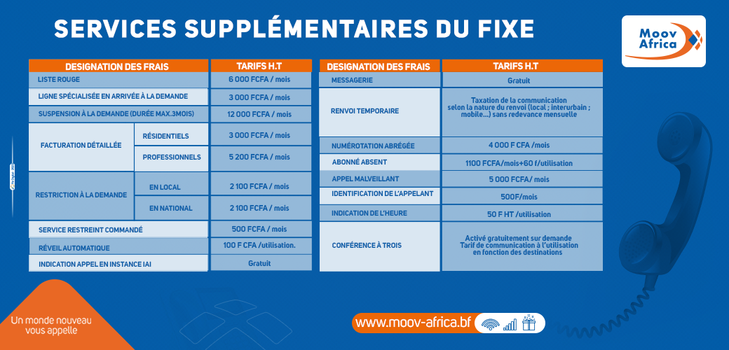 | Service | Deplacement local, Derangements, Nouvelle installation, Recouvrement, Service de fibre optic – Installation, Service de fibre optic – Modem & configuration, Transfert de ligne |
