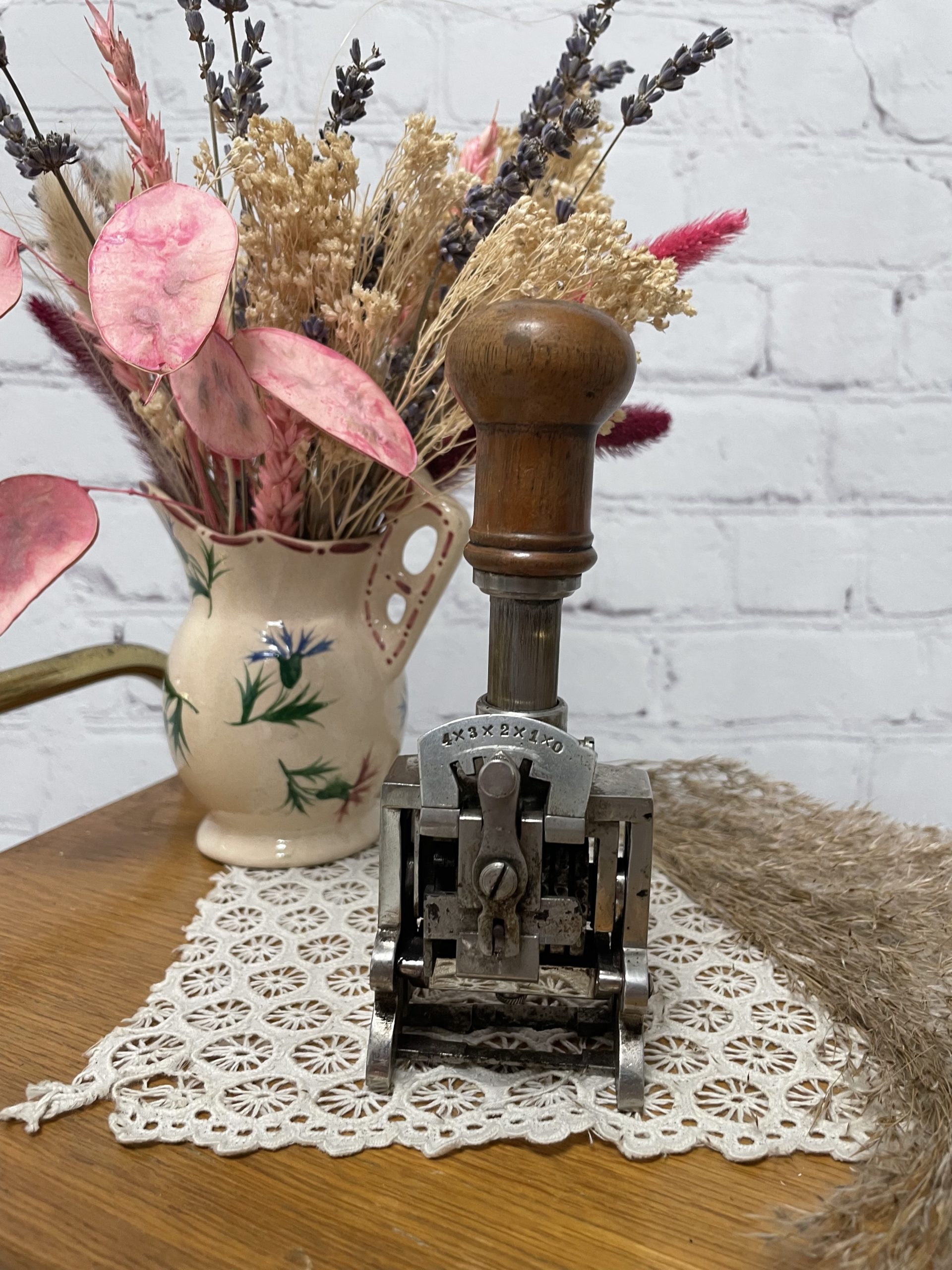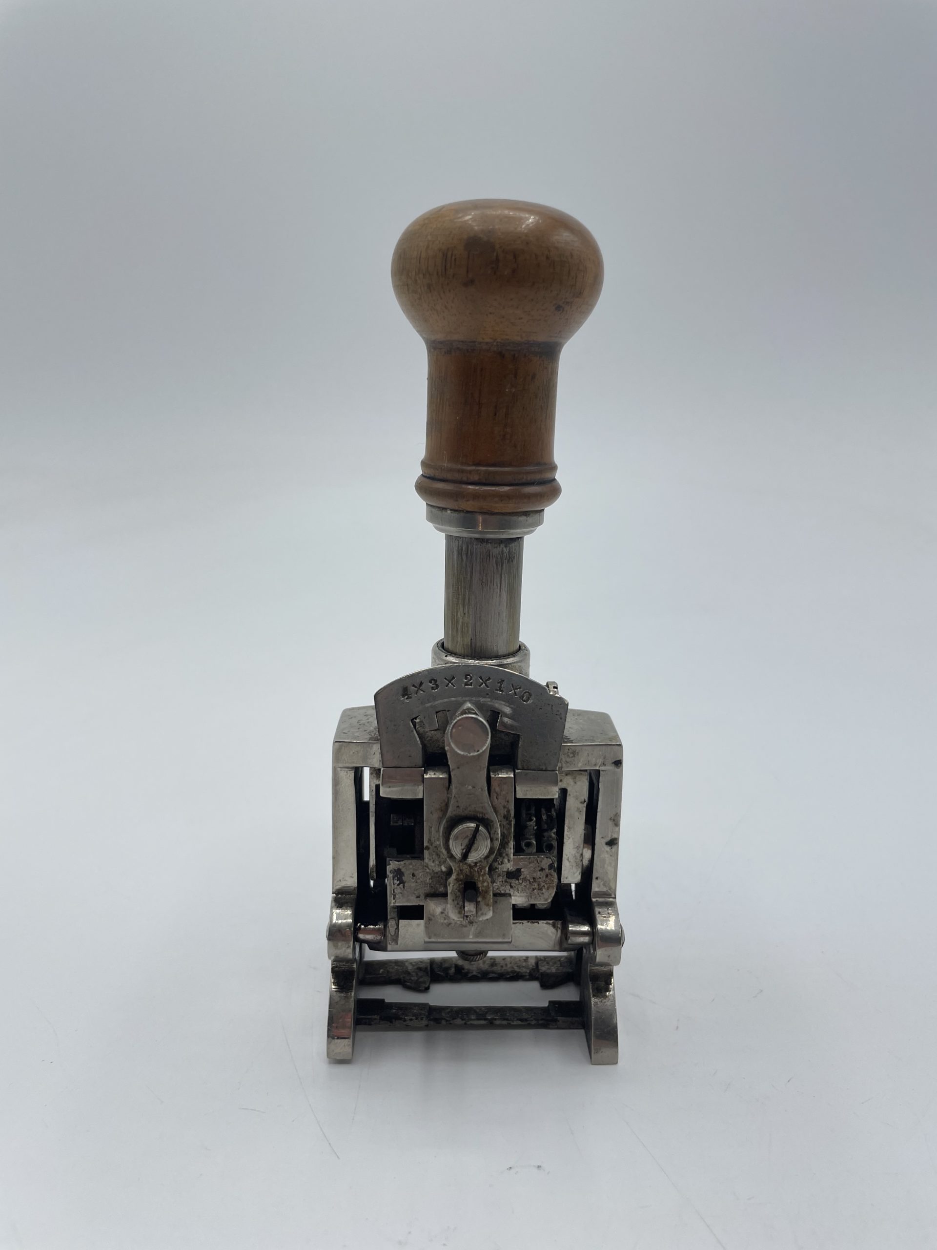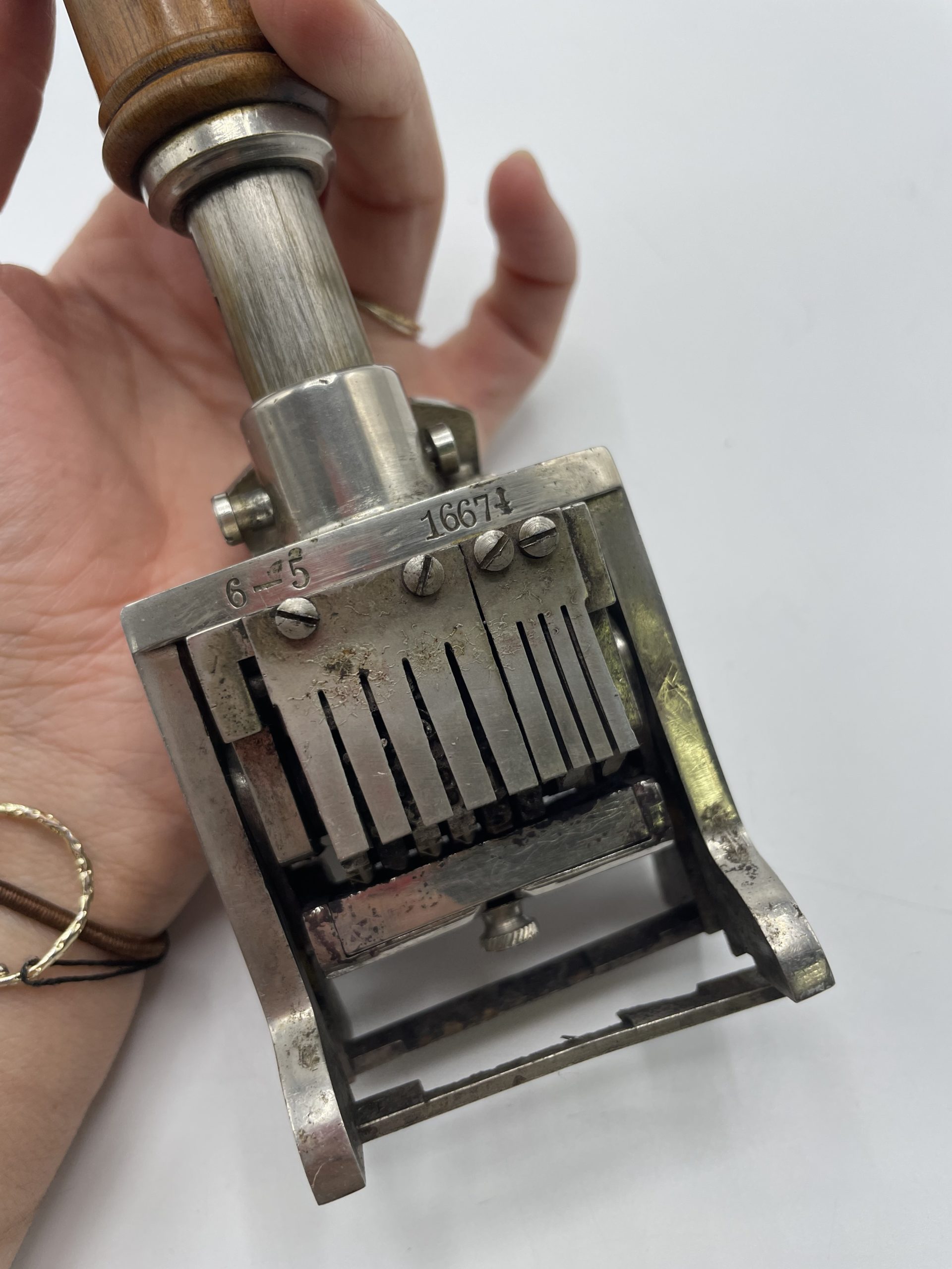 Amateur d’objets ancien et de collection vous ne pouvez passer à côté de ce superbe tampon encreur. Vintage des années 50, ce sublime tampon a sa poignée en bois et il est équipé de numéros chromés et l’on peut choisir de tamponner une suite de numéros ou de dates qui défilent automatiquement. Vintage,d es traces d’usure sont à prévoir (cf photos) jolies arques du temps passé. Un joli tampon ancien à collectionner !