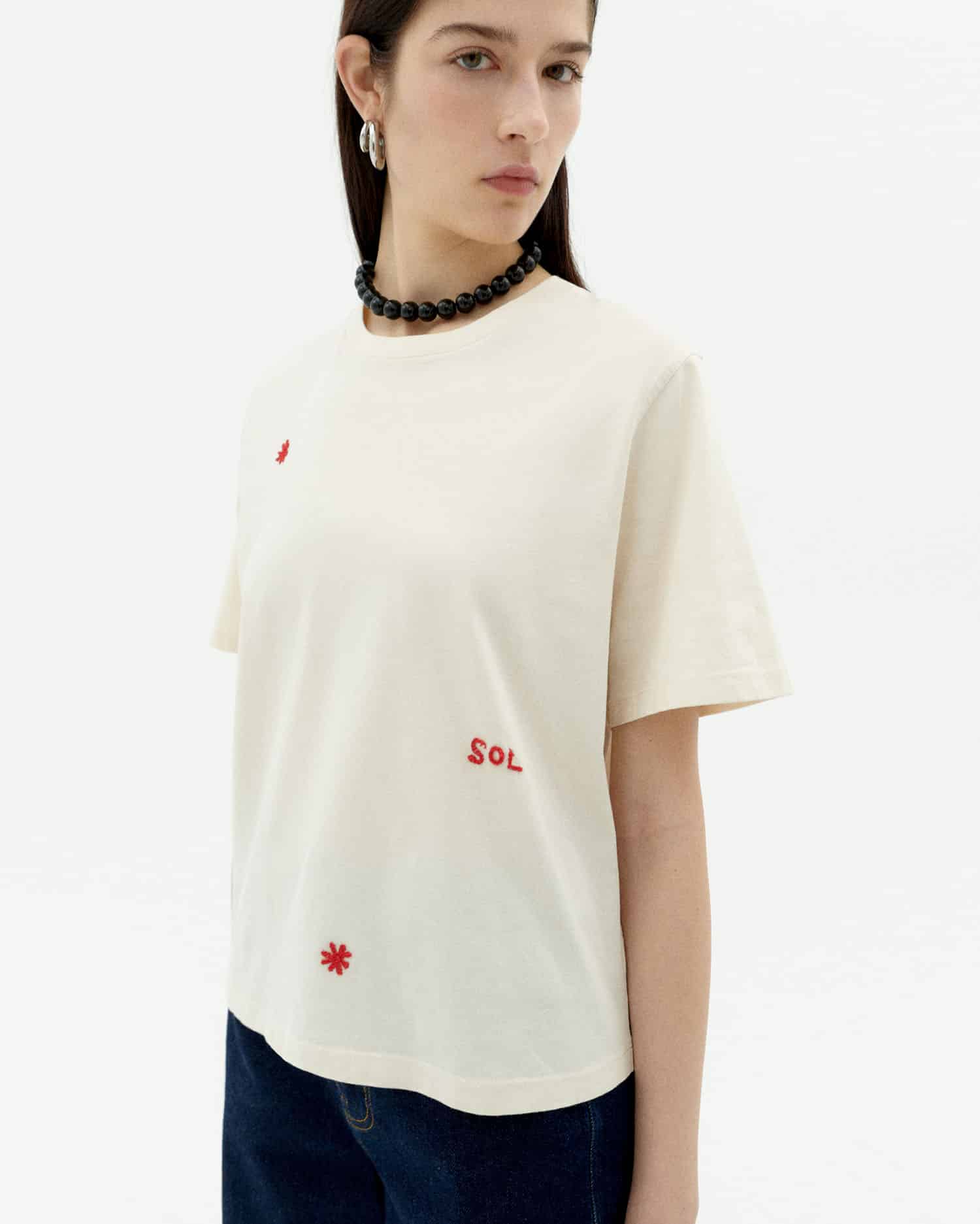 Le tee-shirt solsol écru et ses petites broderies soleil rouge, de le marque Thinking Mu, plaît beaucoup! Dépéchez vous!