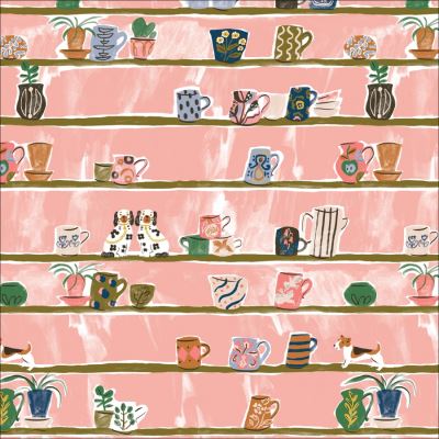 Sur ce fond couleur rose poudré, un peu patiné, on retrouve des étagères avec toute une accumulation de bibelots, de tasses, de vases,… Tous ces objets que l’on retrouve chez soi. Les couleurs sont douces pastels reposantes. Cet imprimé peut se coordonner avec un autre tissu de ce thème.Tissu Sanctuary Ecru